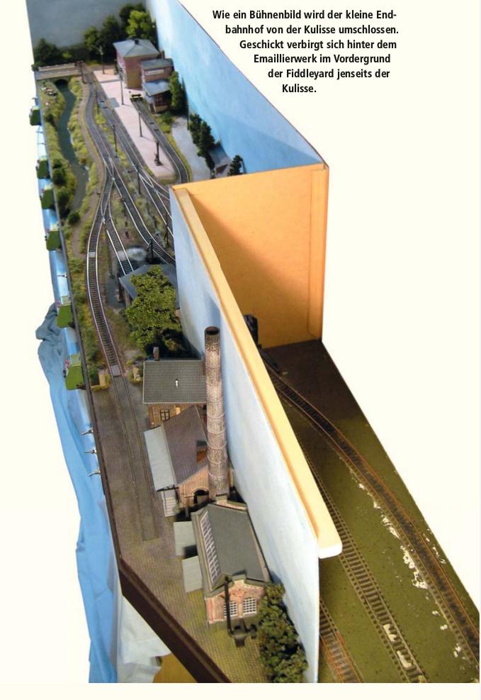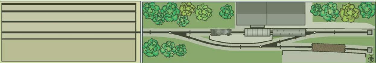 Kolejiště je koncová stanice nějaké lokálky a do vjezdového zhlaví je zaústěna i krátká vlečka. Tovární objekty jsou znázorněny poloplastickými kulisami a traťová kolej je schovaná za kulisami. Hned vedle je remíza, která částečně zakrývá vjezdové zhlaví. Celková dispozice stanice je sice typicky německá divočina, ale uspořádání kolejí a objektů na "jižní" straně vjezdového zhlaví připomíná jednu českou koncovou stanici, dříve nákladiště se zastávkou, a to Bílý Potok pod Smrkem. Objekty remízy a/nebo továrny je možno v V. a VI. epoše znázornit i jako nefunkční ruiny (= právě případ toho Bílého Potoka) a doplnit je příslušně divokou vegetací, což může částečně nebo i zcela nahradit pevnou kulisu.