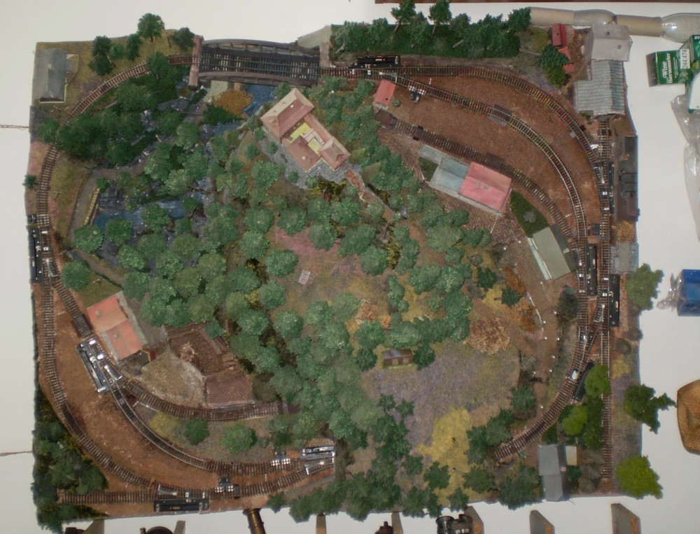 Kdysi jsem se o tohle kolejiště pokusil. Bylo to fiasko - nezadařilo se mi dobře udělat to šroubovicové stoupání v tunelu a vlaky nedržely na kolejích. Následně jsem z toho udělal klasický ovál v rovině a to už fungovalo. Léta pak viselo jako obraz na zdi a nakonec skončilo prostřednictvím firmy WEPE jako zdroj náhradních dílů v nějakém klubu (patrně v Pečkách).