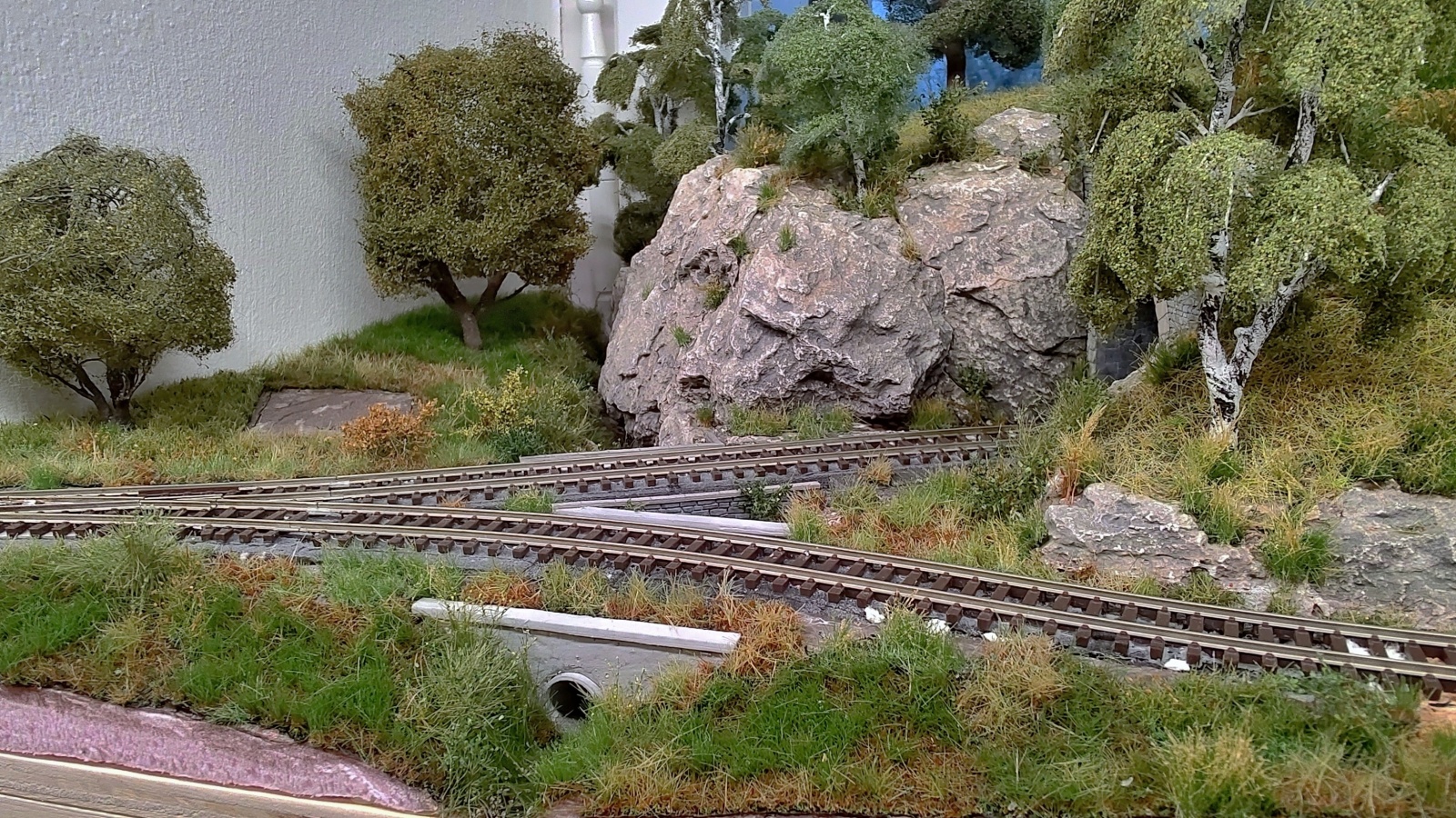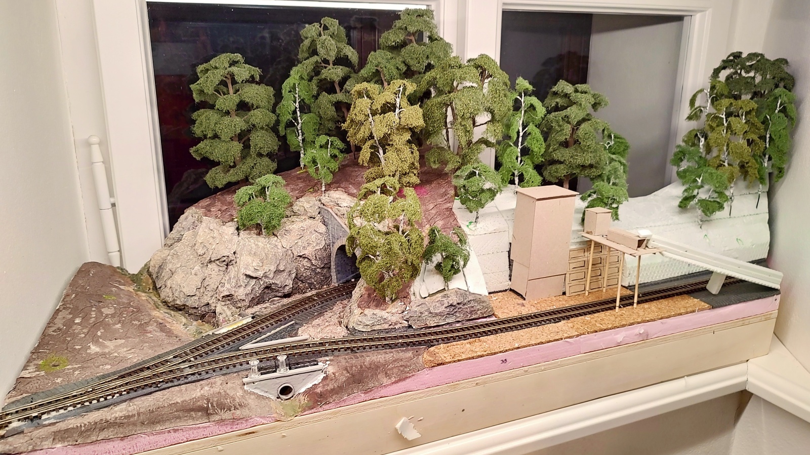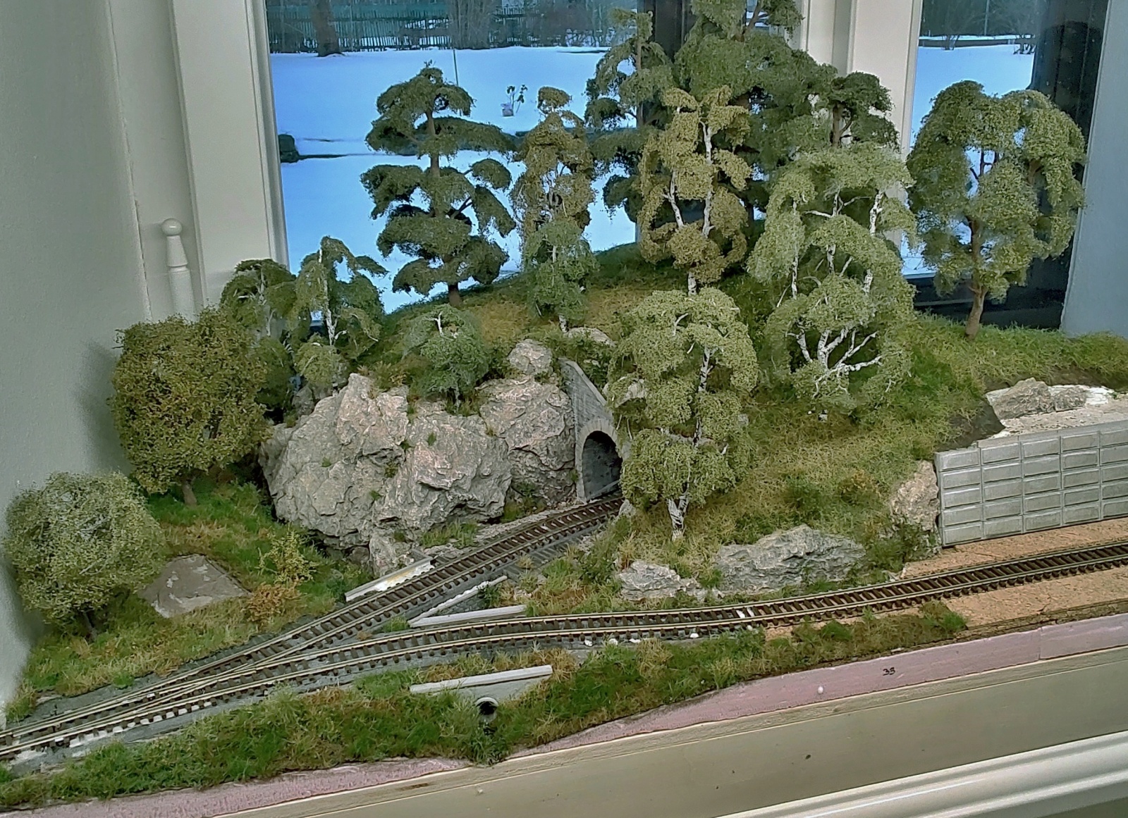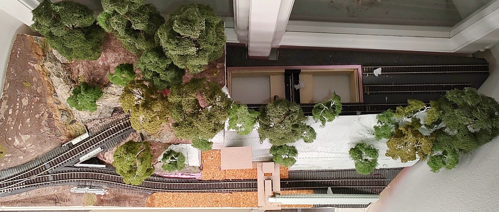 Já bych dal fotopozadí až za kolejiště, na okno. Tam je šance na nějakou hloubku pohledu. Fotit se bude stejně spíš na makro zblízka a z roviny kolejí, pro případné dálkové pohledy by zas neměl být v záběru lom nad tunelem. Díru mezi kopcem a oknem potřebuji zachovat otevřenou po manipulaci na přesuvně. Stejně je to tam jako něco lovit v záchodě - šířka výřezu je jen cca 12 - 15 cm a jsou tam tři koleje, výška stromů na kopci je asi 30 cm a ještě tam sahám přes osvětlovací LED profil... :D