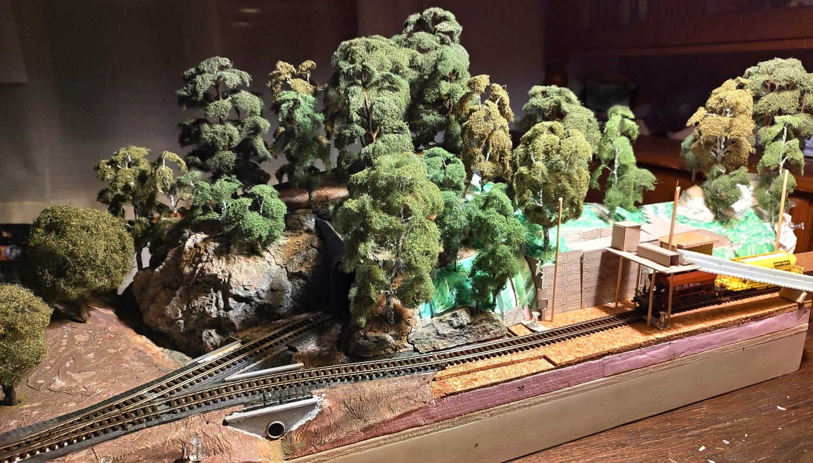 Chce se mi říct "co tam furt vymýšlíte, dyť je to dobrý". Stačí oba kopce opticky přizvednout vhodnou výškou stromů, a veškerý lom a podobnou lidskou činnost naznačit na zeď vpravo nebo si ji představit vepředu před kolejištěm. Na kopec nad násypku leda plot proti divoké zvěři. Ta koncentrace skvělých nápadů a provedení na dvou třetinách čtverečního metru je už teď neuvěřitelná.