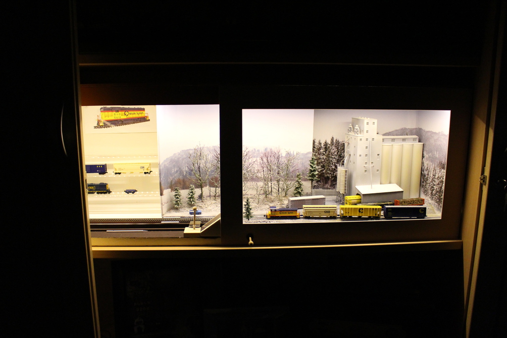 Není to nic až tak světoborného: Upravený inglenook v eNku na ploše 100x28 cm vysoký 36 cm se scénickou částí dlouhou 57 cm představuje vlečku do obilního sila v USA. Nicméně jako užitečná inspirace může posloužit práce s několika úrovněmi kulis, minimalistické ovládání typu "všechno, co může být na ruku, je na ruku" a taky primitivní způsob uložení a ruční výměny vozidel v zákulisí.