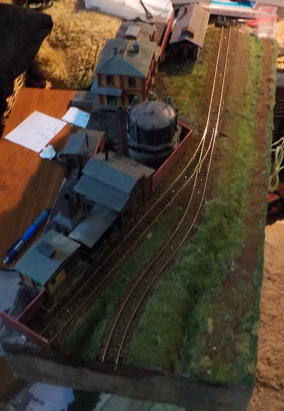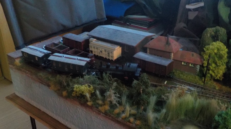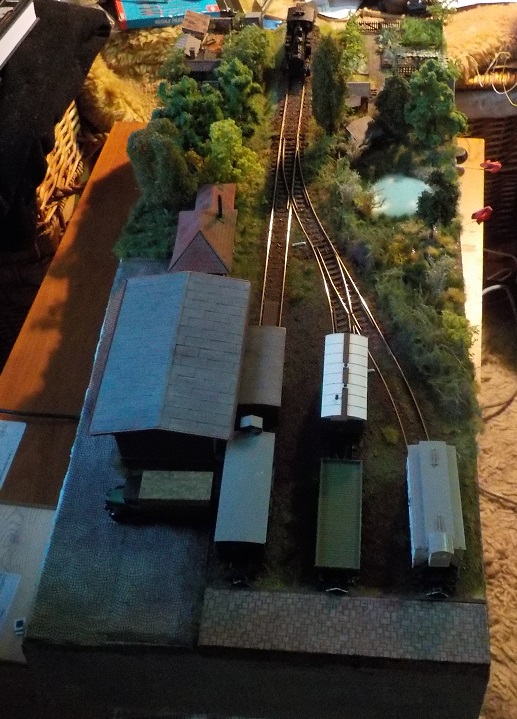 Trošku jsem to došolíchal, časem přibydou drobné detaily a "konec posunu" dostane leptané náhrady přiměřené velikosti. Stávající jsou narychlo vystříhané a ručně domalované z plastu a rozměrově spíš k nulce. Provozní testy zaměřené na šíbování ukázaly, že prakticky lze manipulovat pouze čtyřmi vozy, pátý na konci u volné plochy za skladem se bez prodloužení či připojení šoupaliště "jinam" nelze přemístit. Pokud by šlo jen o odstavení vozů, lze jich tam dostat až sedm (krátkých). Taky uvažuju o kulise.