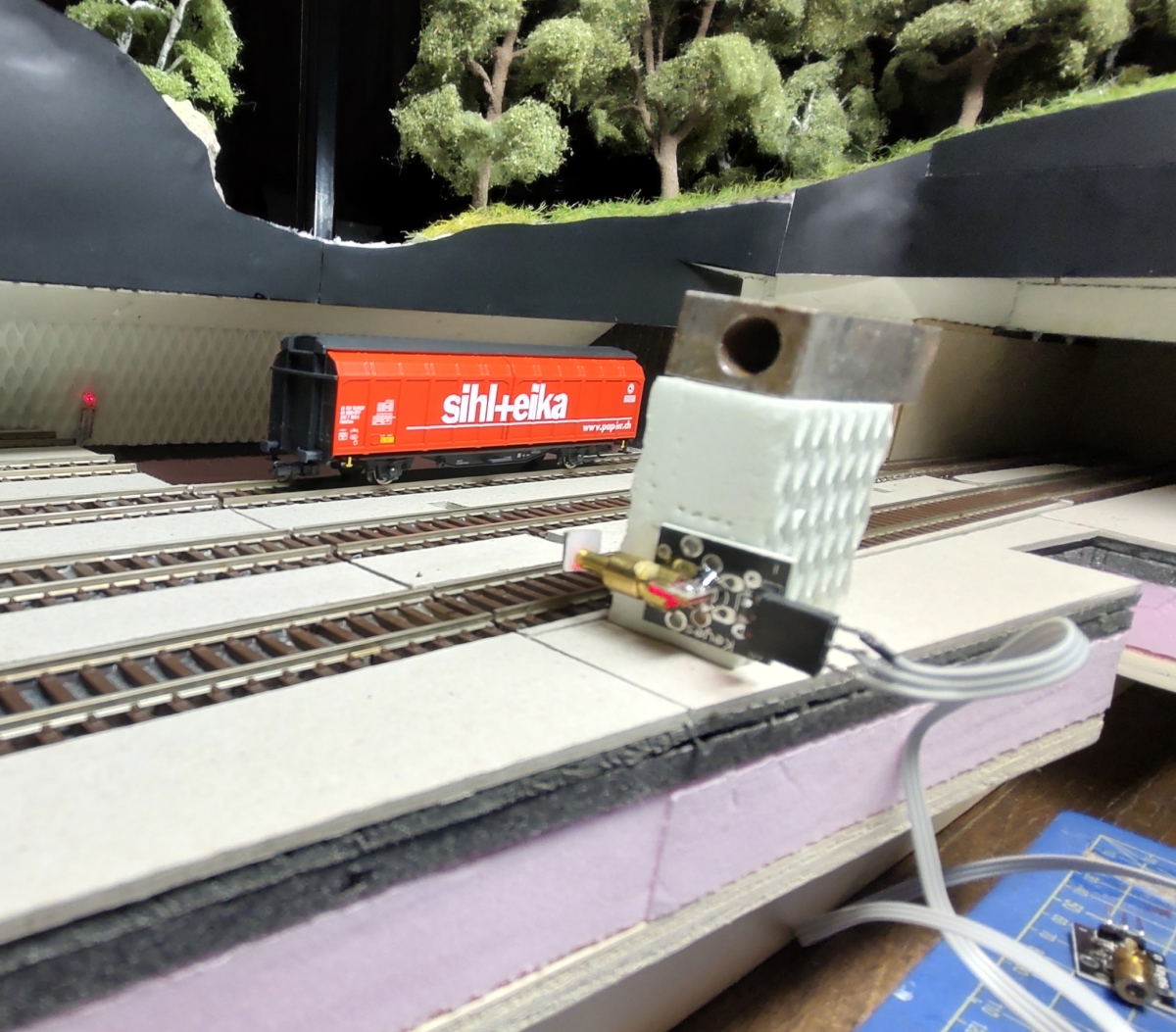 přijímače. Z obojího jsme použil jen samotný prvek, bez destičky. Když tubus diody přelepím mosazným plechem s 0,5 mm dírkou, můžu detekovat skrz rovinu nárazníků a spolehlivě to zabere. Vyrobil jsem takové L z hliníkového profilu, diodu chytil příchytkou na telefonní kabel a přijímače se nalepí na protější stěnu. Mám celkem 4 paprsky, z každé strany přesuvny dva, abych zabránil přesahům přes dělicí rovinu. Očekávejte další zprávy.