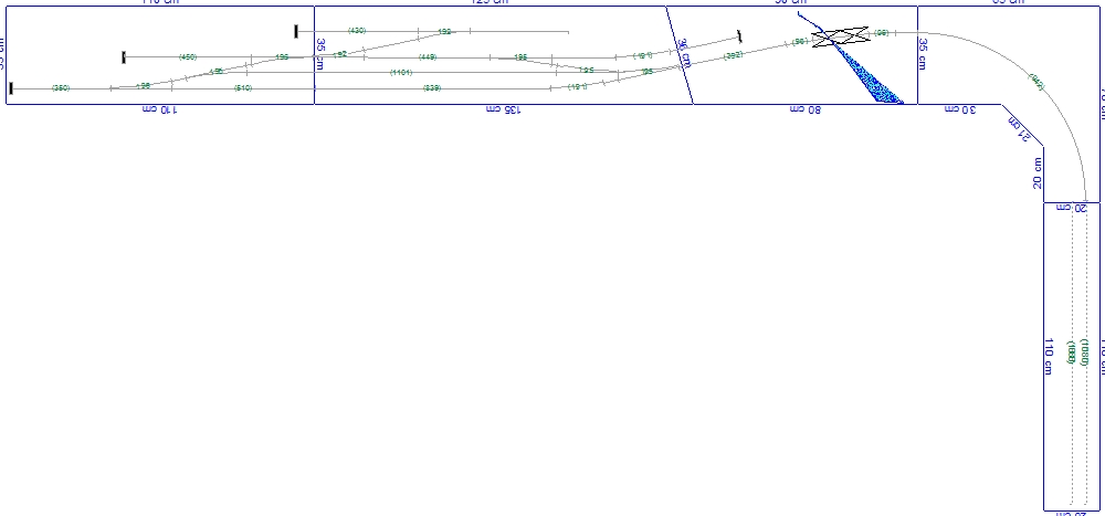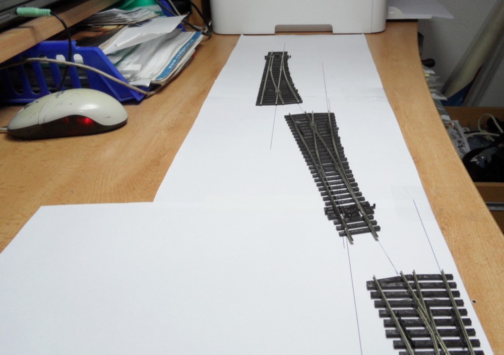 Vymyslel jsem dělení segmentů. Spojení segmentů bude pak víceméně trvale, ale pro stavbu a případné "stěhování někdy" jsem to rozkouskoval takto zleva 1 až 5. Dělení je navrženo tak, aby se využilo co nejvíc spojů daných rozvržení vyhybek a flexi. Vyhybky ještě nemám, ale už podle kopií 1:1 mi vychází geometrie trochu jinak. Abych dodržel vzdálenost os 57 mm, budu muset vkládat vložky 20 a 53 mm, aspoň tak mi to vyšlo. Ve WT u vekslí proti sobě vychází taky 20mm, ale za sebou vycházelo jen 45mm.
