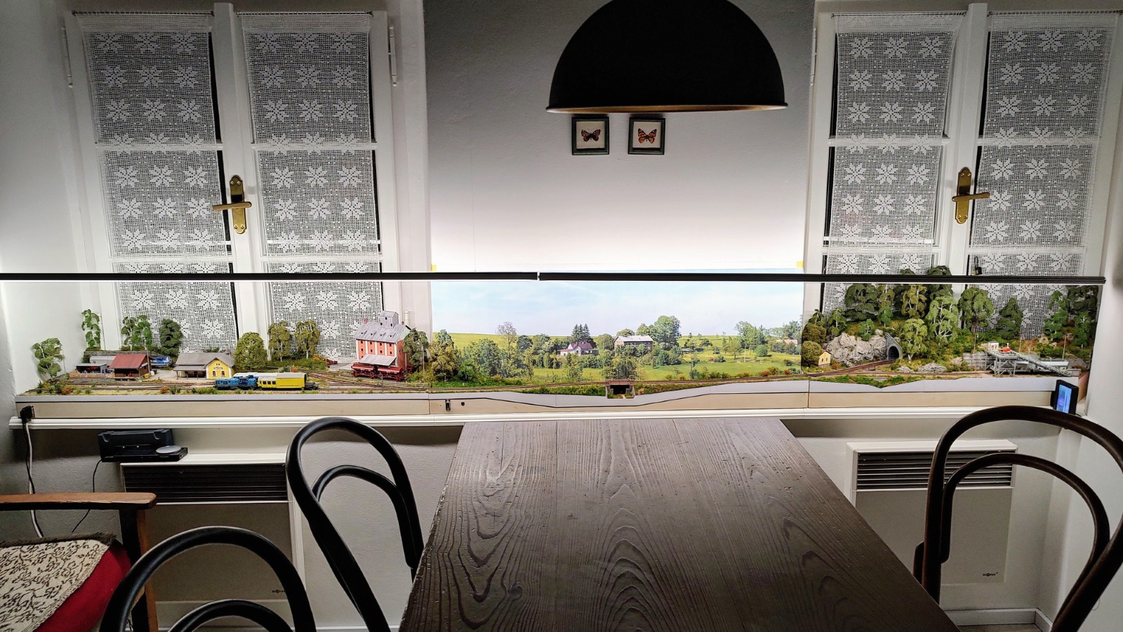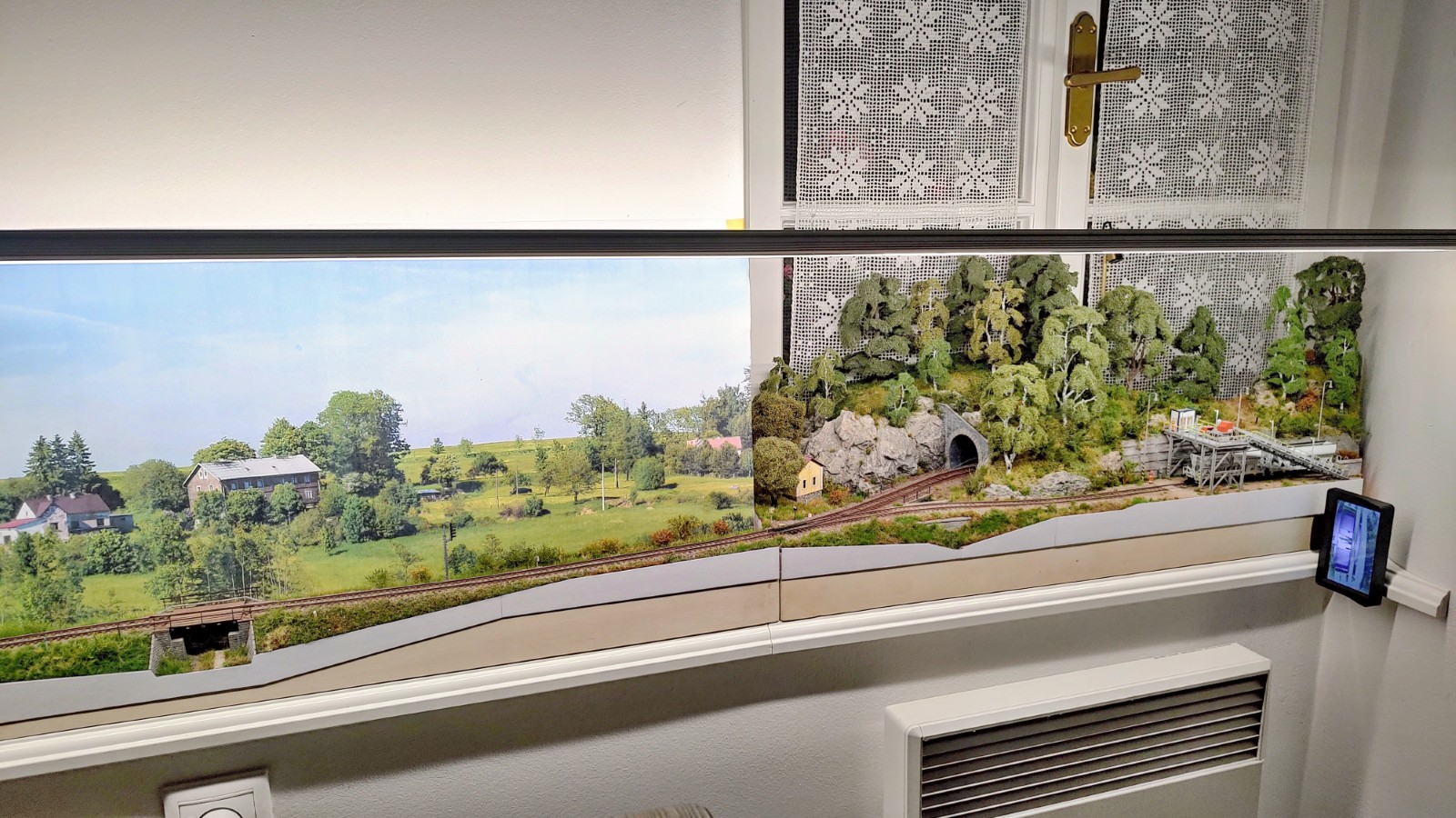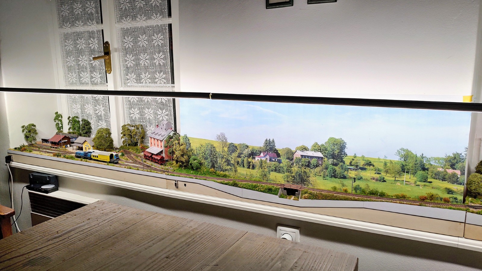 Pozadí - mělo by to technickou výhodu, že by krylo kolejiště před ranním sluncem, aby nevybledlo. Současně by to ale byla jeho největší nevýhoda, připravil bych se právě o ty ranní momentky. Možná jen něco na boční stenu za sýpku, jako pokračování té fototapety uprostřed. Ale jak píše Ivan, nepokazit kouzlo kolejiště na okně.