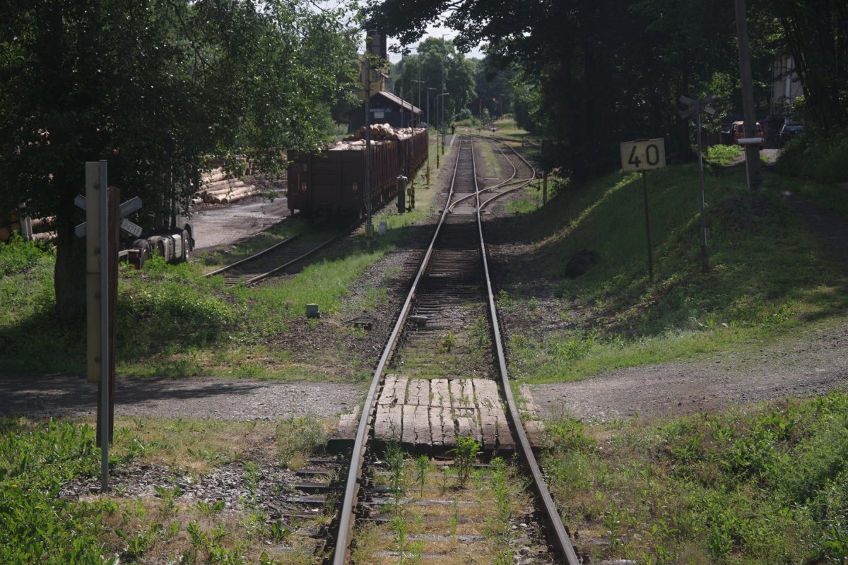 Lomnice nad Popelkou, nalevo za výstražným křížem, ale kvůli přejezdu se tam jezdí stejně jen 10.