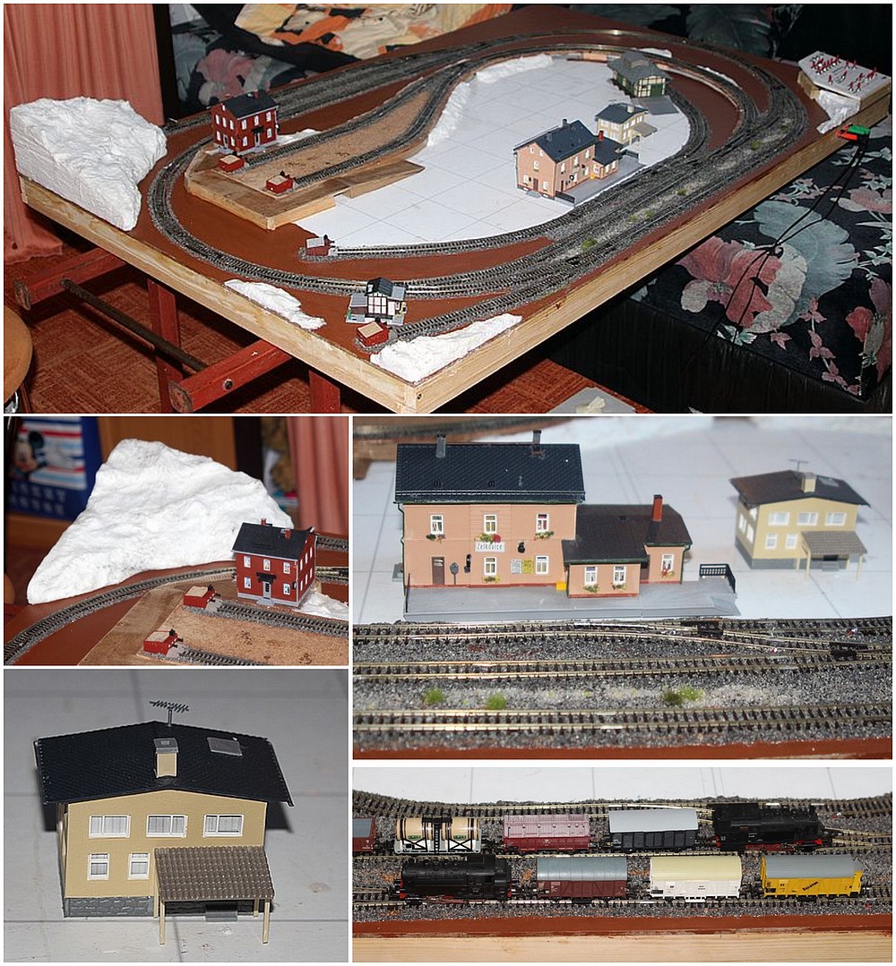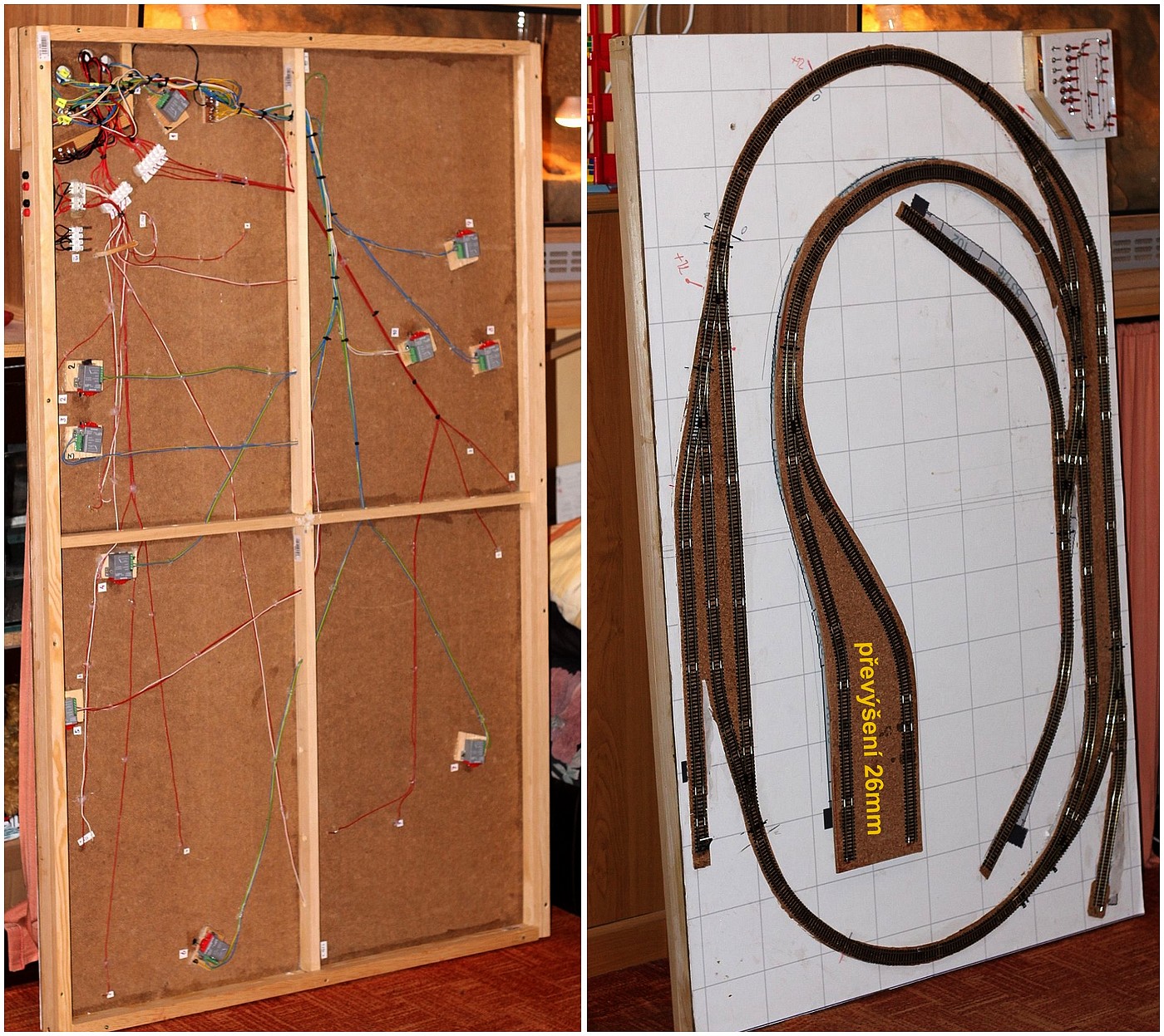první etapu kolejiště (položení kolejí, zapojení výhybek, přestavníků a přerušované kolejové úseky). Celkem je na kolejišti 10 přerušovaných úseků a 10 výhybek ovládaných motorickými přestavníky MP1, polohu výhybek ovládám dvoupolohovými mini přepínači. Všechny ovládací prvky jsou umístěny na malém pultíku (o rozměrech 155x155 mm) a jsou řešeny mini přepínači. Pult zatím není připevněn (na foto je to vidět) to až po zkoušce ...