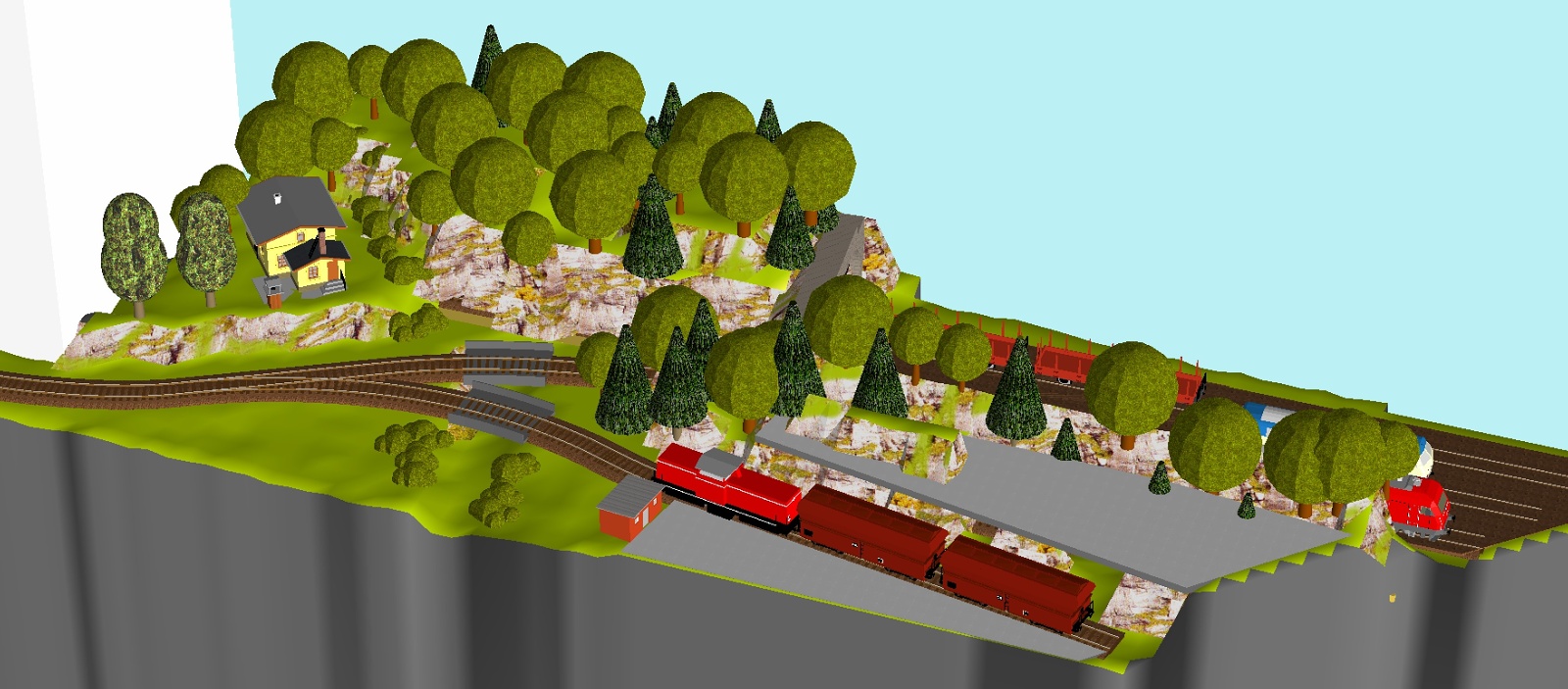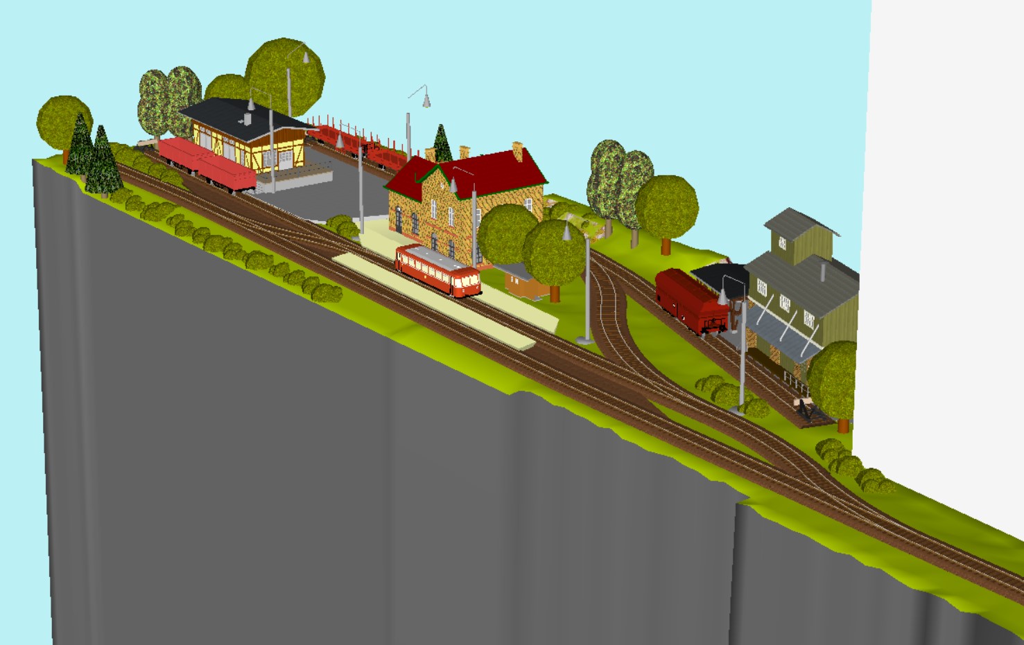 Fakt je ten, ze stanicni koleje jsou kratke - jejich natazeni od Vojtase ma dobrou myslenku, ale ja bych zkusil natahnout ze strany druhé: dvě výhybky posunout ke kraji panelu současne se skladistem, které by se ukrojilo. Sturc u skladiste bych zrusil a evokovalo by to, ze to pokracuje dale. Ale nevim, nakolik mate dlouhou kolej pro obraceni lokomotiv... prizpusobil bych ji te nejdelsi O:-)