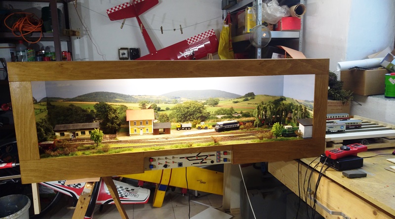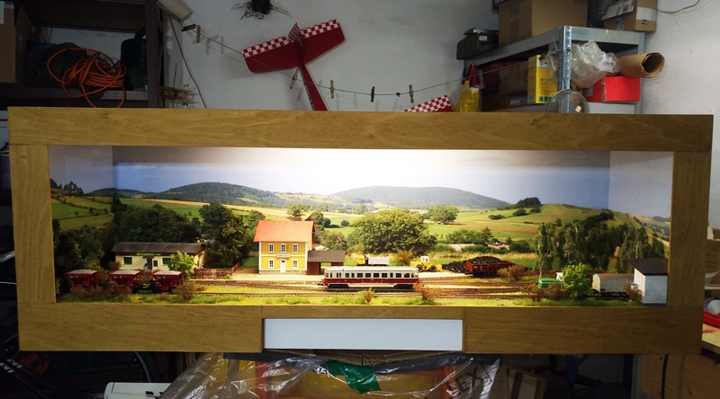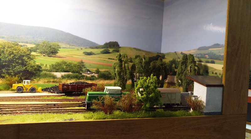 Naopak bych tu kolej využil pro odstavení mašiny směrem z přesuvny a pro najetí na soupravu ( objetí ). Les by tu mašinu schoval a viditelná kolej by zůstala v bedně jako kusá zarostlá. Navíc by ten lesík schoval i tu druhou provozní díru.