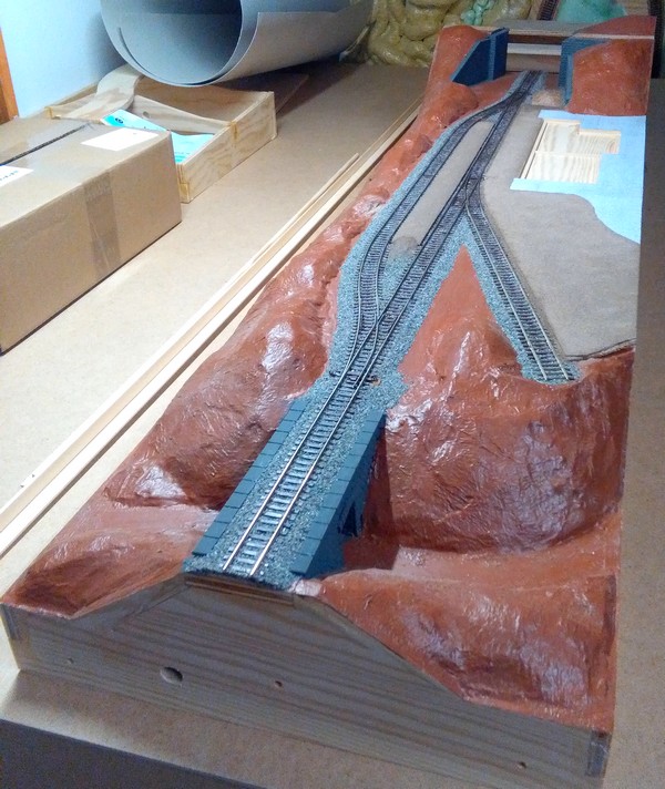 Na pěnu je po ořezání nakašírovaný toaletní papír ( lepidlo Dispercol ) a po zaschnutí je to natřené vodouředitelnou barvou Balakryl. Následovat bude posyp hlínou ( opět lepidlo Dispercol ) a pak statika.