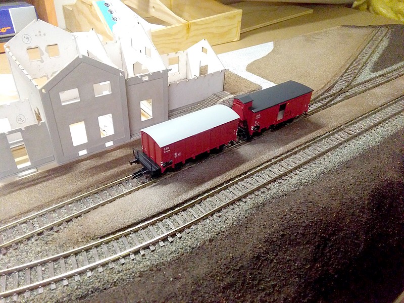 Občas je potřeba si udělat radost... Za hotové úpravy terénu jsem se odměnil novinkovým vagonem s budkou a přibral k němu zetku s plošinou. :) U toho s budkou mě potěšilo funkční otevírání dveří. Ještě by to chtělo nějakou menší páru , třeba 310sítku kafemlejnek.