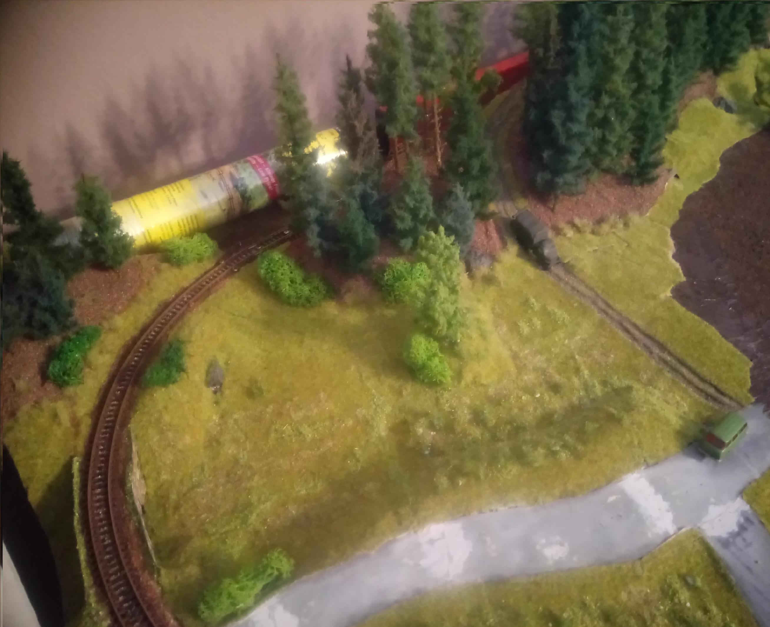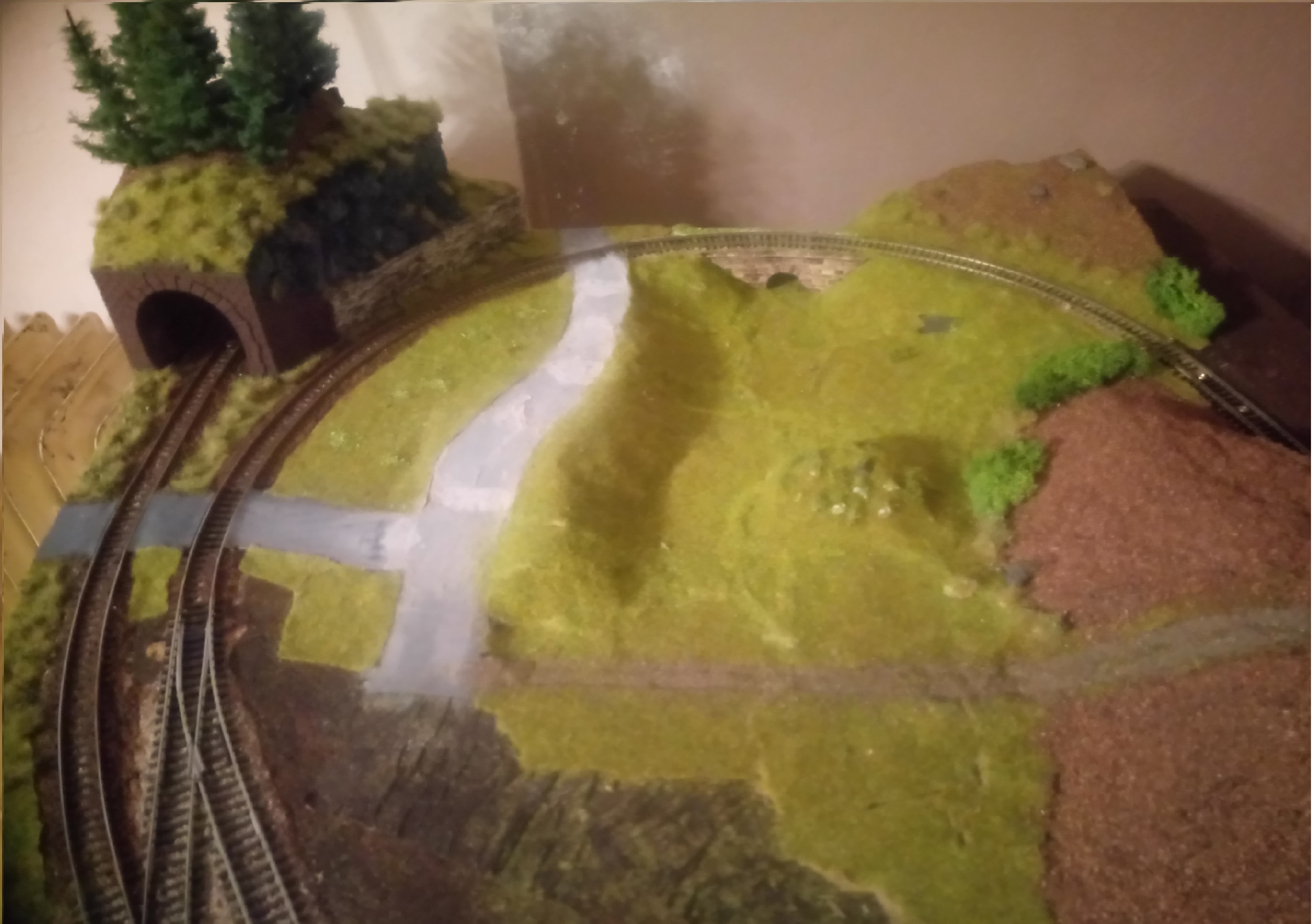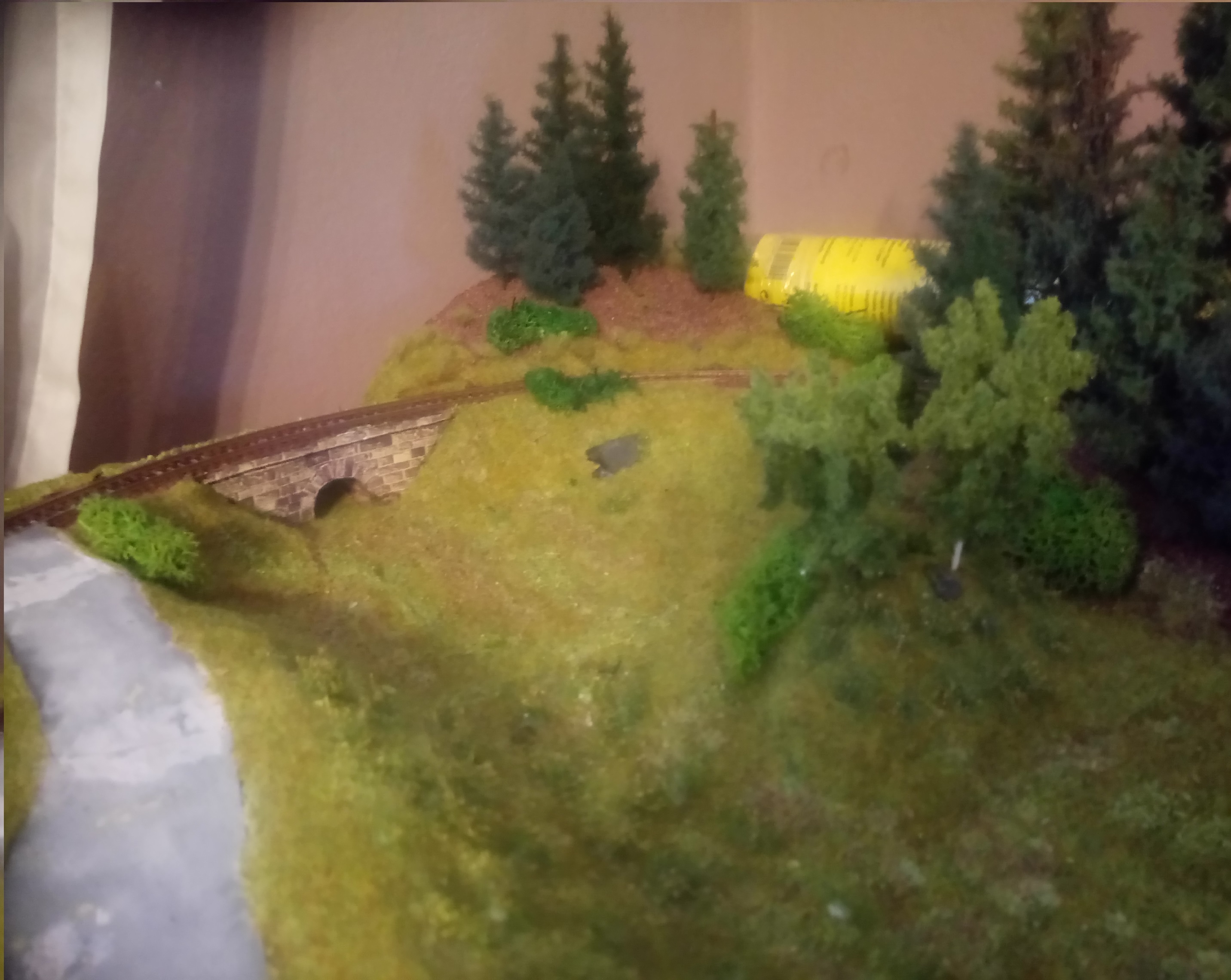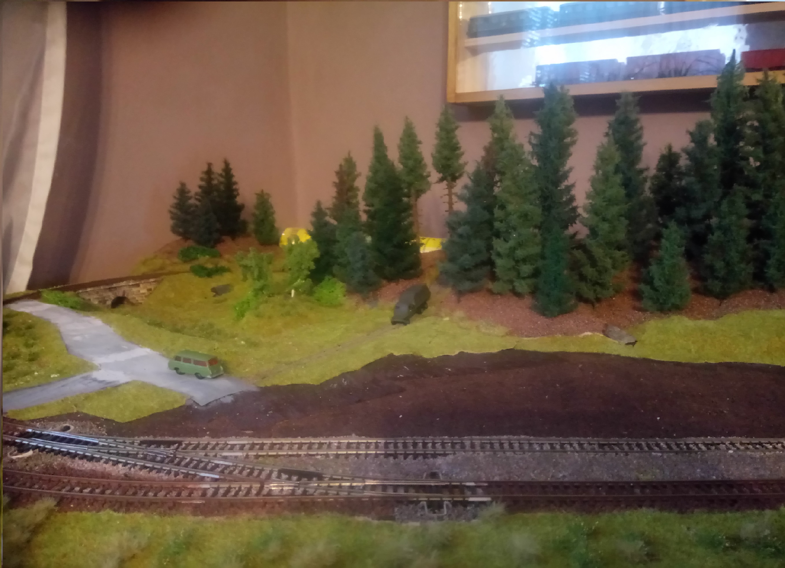 Zazelenalý jeden roh, kam zajíždí motorák. skála byl můj první pokus, i když první pokusy mají končit v koši. Momentálně už koleje orezlé a silnice přijde přetmelit a přebarvit. Dále nákladová rampa, co se mi moc nelíbí, zřejmě jí vyloupnu a pokusím se udělat hezčí. žlutý pásek je smirek, který přijde nabarvit na beton jako betonová hrana. Nalevo od nástupiště přijde ,,navéz,, zemina, která se bude zvyšovat až k bílé stěně a bude tvořit možná zalesněný, možná travnatý kopec.