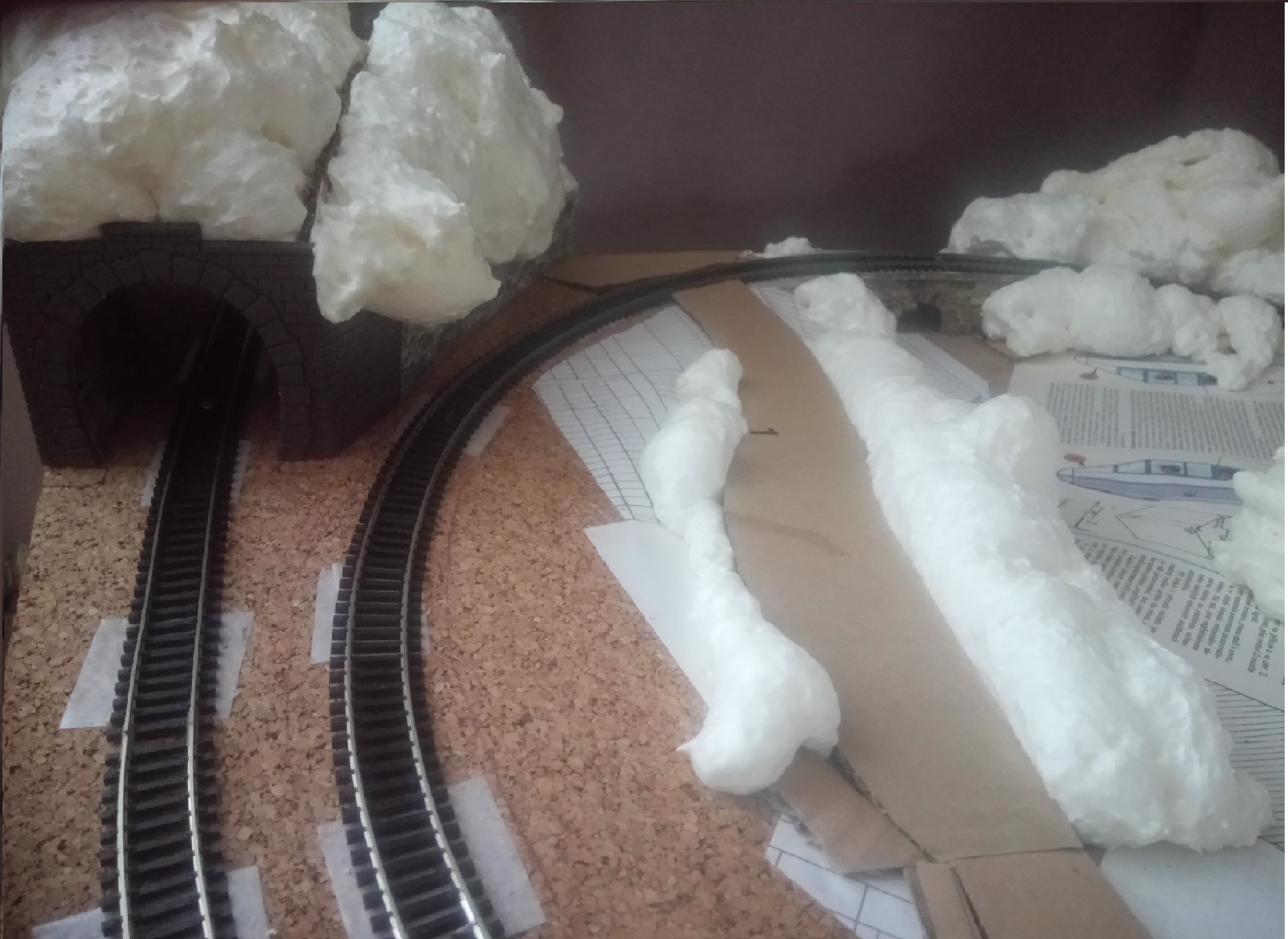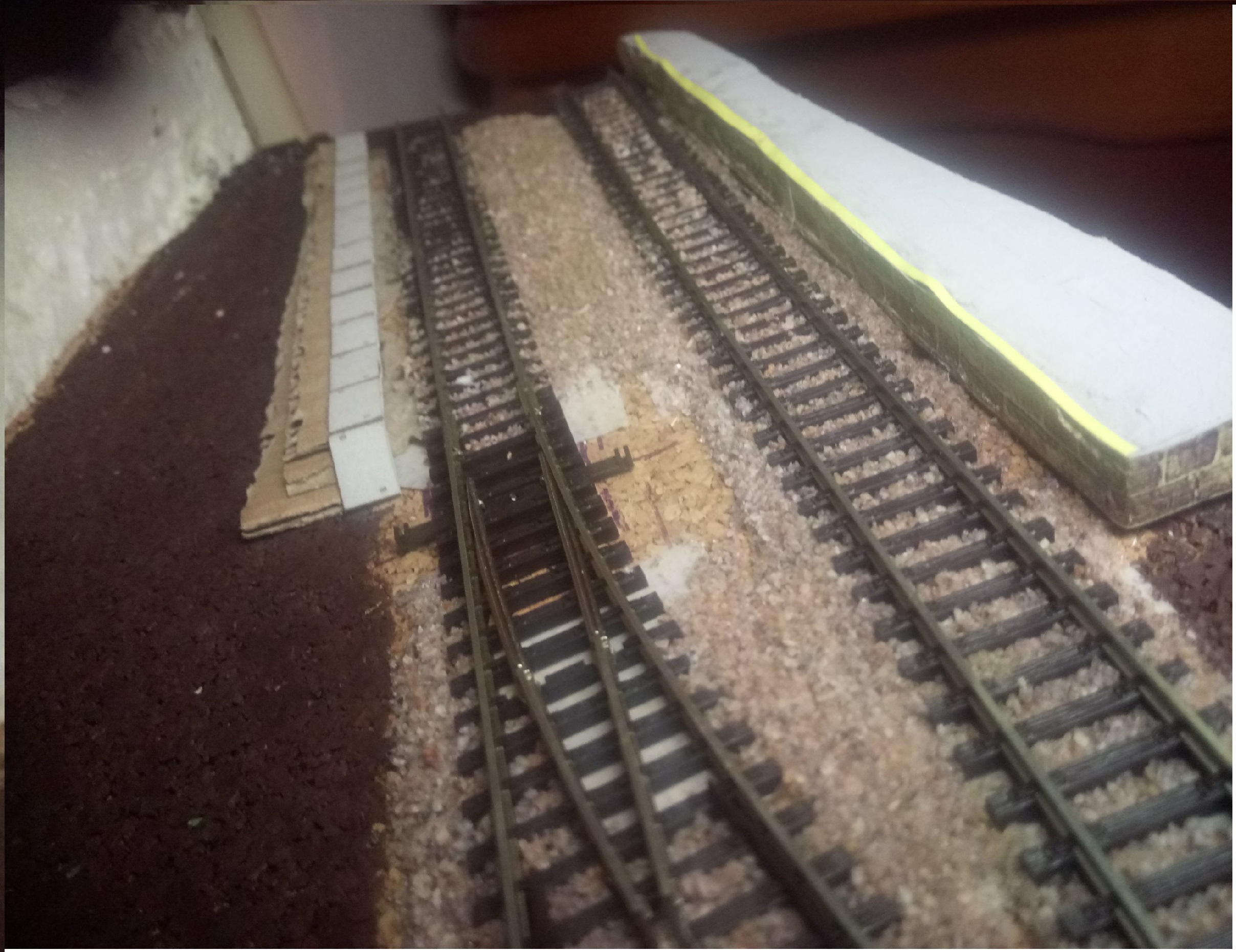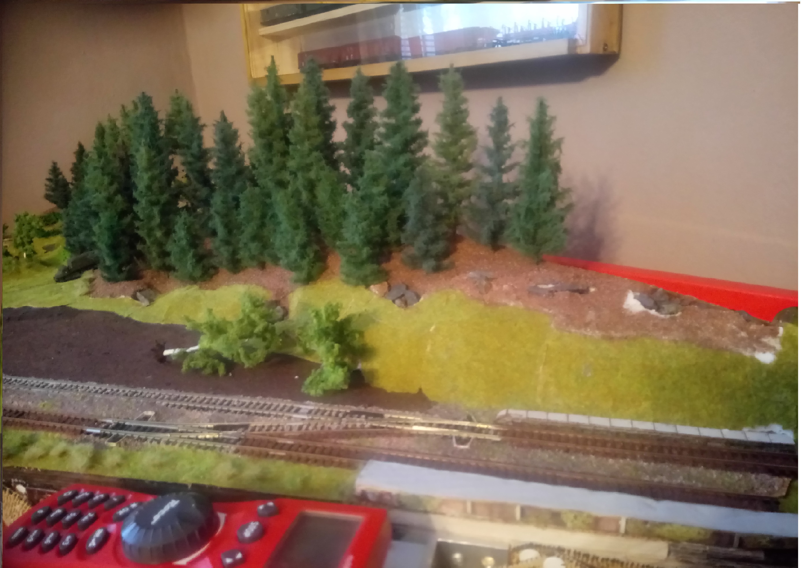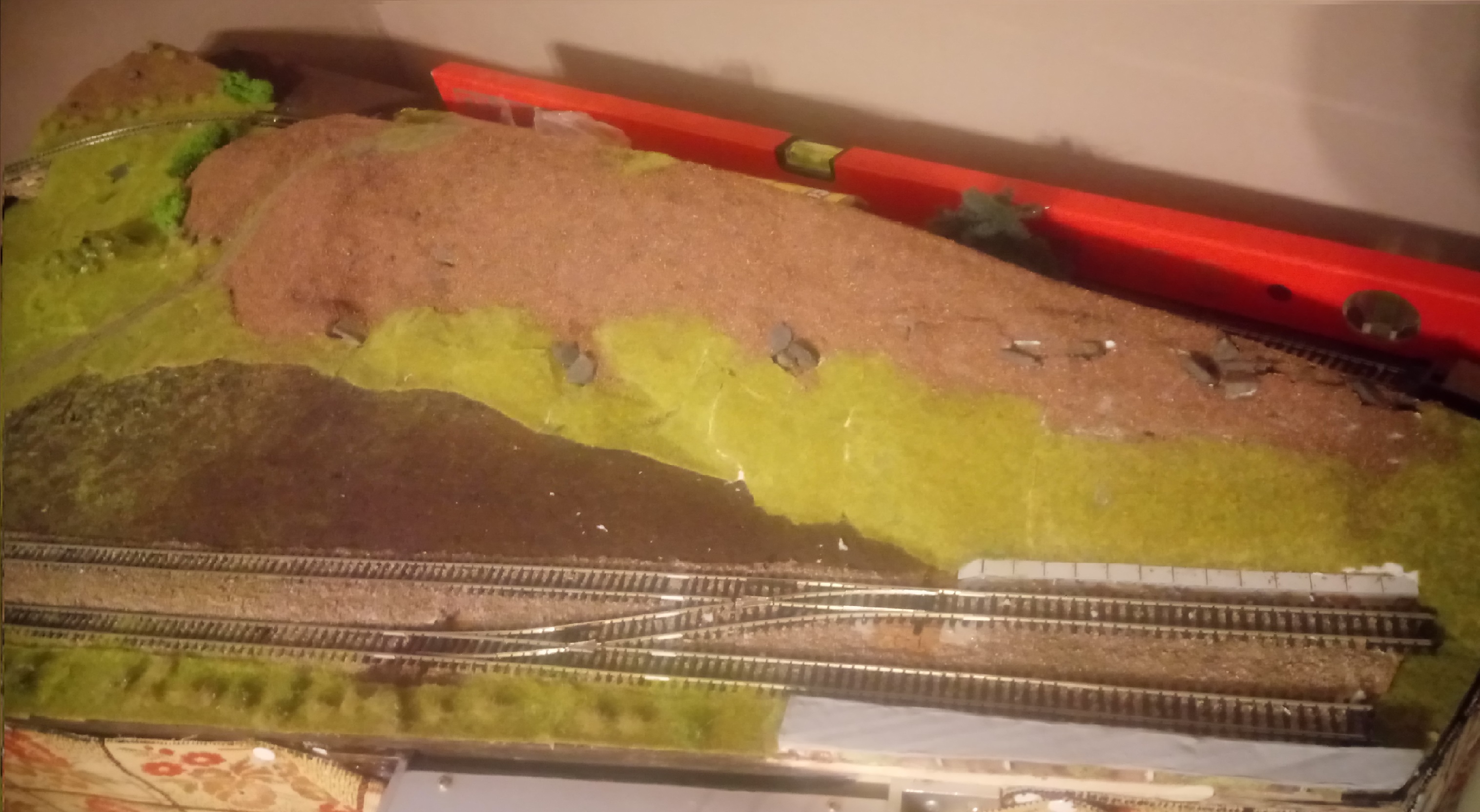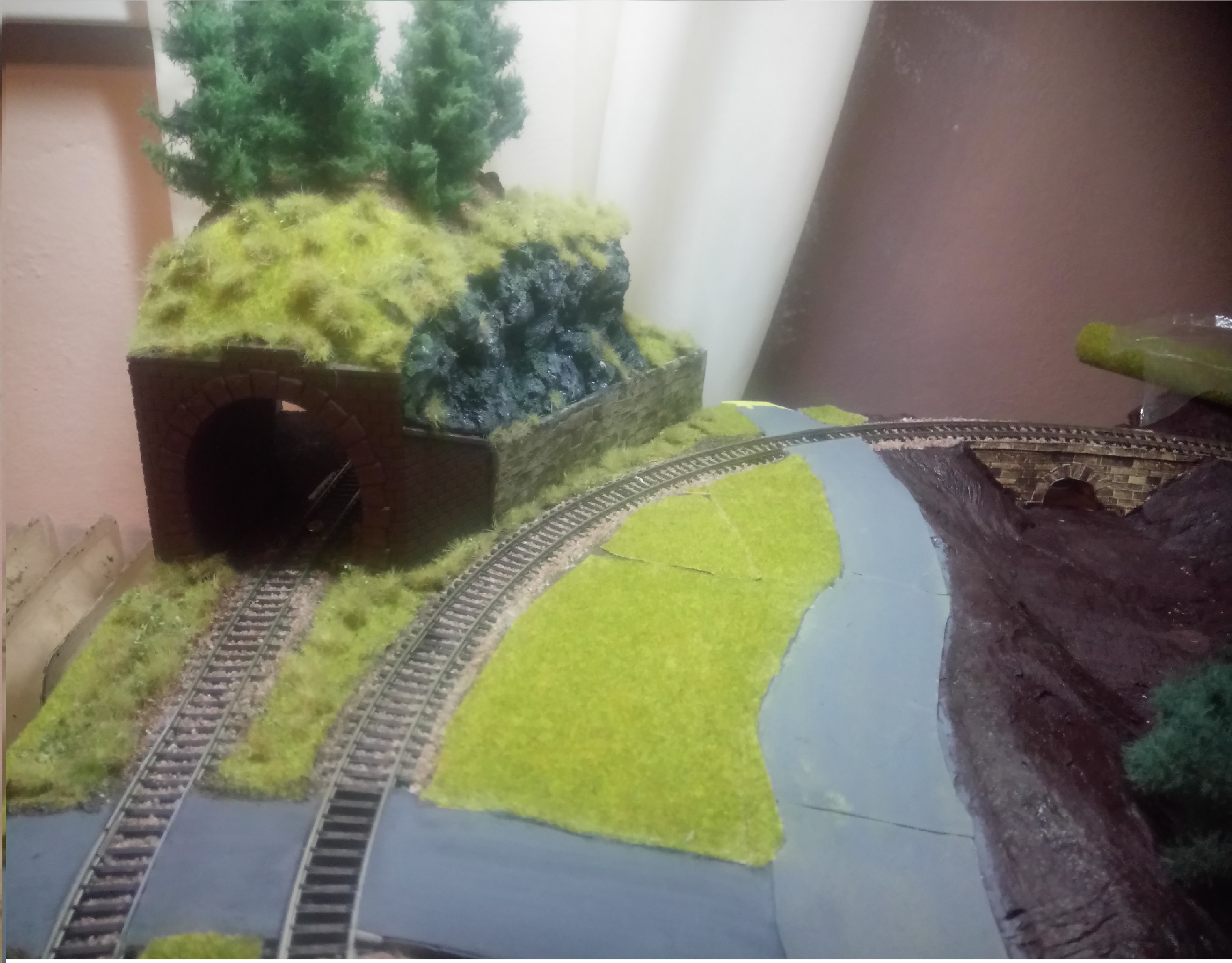 Zazelenalý jeden roh, kam zajíždí motorák. skála byl můj první pokus, i když první pokusy mají končit v koši. Momentálně už koleje orezlé a silnice přijde přetmelit a přebarvit. Dále nákladová rampa, co se mi moc nelíbí, zřejmě jí vyloupnu a pokusím se udělat hezčí. žlutý pásek je smirek, který přijde nabarvit na beton jako betonová hrana. Nalevo od nástupiště přijde ,,navéz,, zemina, která se bude zvyšovat až k bílé stěně a bude tvořit možná zalesněný, možná travnatý kopec.