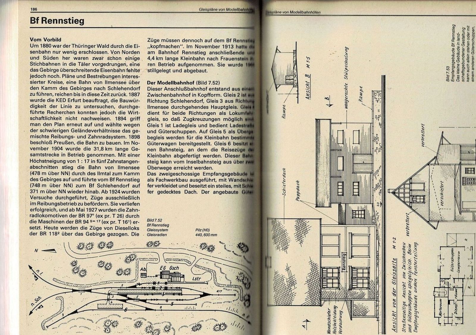 1. Rennsteig ještě před r. 1913, tj. před vybudováním malodráhy do Frauensteinu (zvané též Die Laura, zrušena byla v r. 1965). Durynská trať Ilmenau - Schleusingen byla vybudována jako ozubnice, Rennsteig byla původně minimalistická úvraťová stanice. Vlaky měly lokomotivu vždy na dolním konci a do kopce sunuly (podobně jako na naší zubačce). Ozubnicový provoz byl v r. 1922 nahrazen adhezním, nejprve s lokomotivami BR 94.5-17 ex T 16.1 vybavenými Riggenbachovou brzdou, později přišly "královny hor" řady 95 DRG, koncem 60. let pak všudypřítomné dieselhydraulické lok. V 180 a jejich rekonstruované klony. Nicméně podobně jako na jizerské zubačce nic nebrání tomu, aby se do kopce tlačilo i v adhezním provozu.