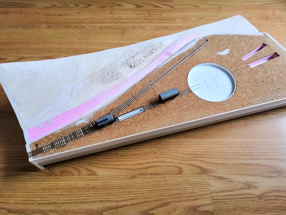 Výhybka a zásobovacia koľaj sú už napevno prilepené s napájaním zvedeným do svorkovnice. Strojová koľaj s popolovou jamou a dnom točne zatiaľ len nasucho.