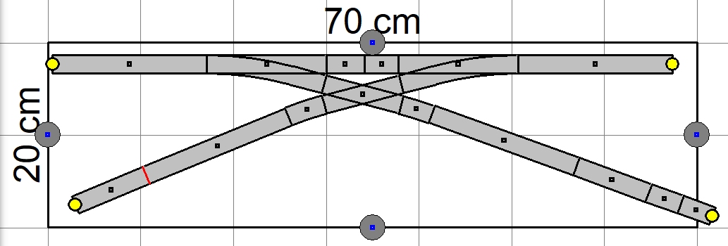 Na mojí verzi je esíčko z důvodu místa pro větší staniční budovu se skladištěm. Dále posunutím více doleva se vejde ještě kolej 36,5 do SN. Kusovky mám jen pro dodržení geometrie , případná stavba bude z flexiny.