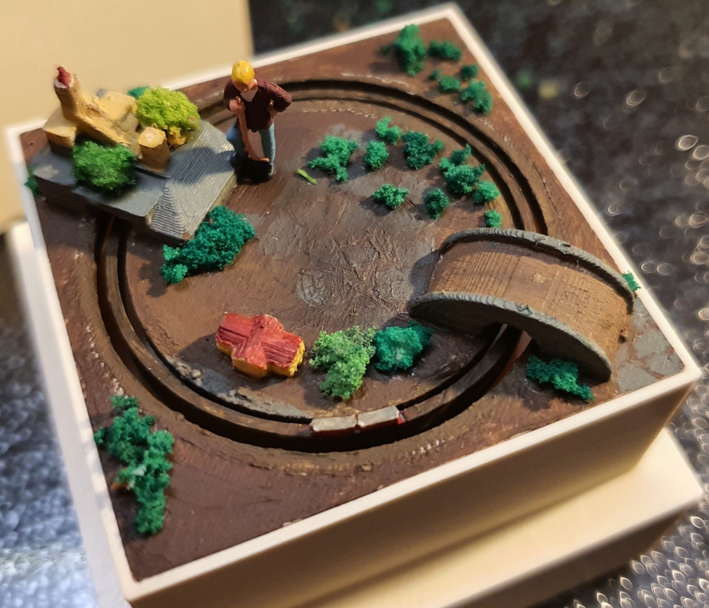 Jedná se tedy o model zahradní železnice 1:32 v TT - tedy původně zamýšlené jako model železnice do zahrádky pana přednosty. Nemám, kam bych ho umístil, tak jsem mu vyrobil ještě krabičku a zůstane vtípkem do kapsy - je to celkem snadno prezetnovatelné kolejiště - zavřené je to kostka o hraně 6 cm.