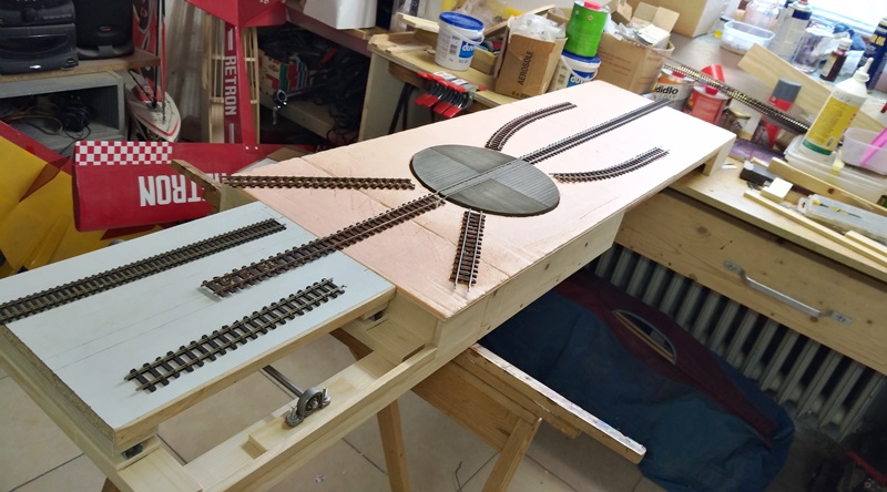 Přesto bude segment znázorňovat část nějakého fiktivního provozu,(zatím nevím jakého) kde ve viditelné části bude točna a 5 kusých kolejí + nějaké stavby. Točna se bude otáčet v rozsahu cca 220°a vejde se na ni malá průmyslová lokomotiva a jeden vůz. To vypovídá i o možném provozu. Vlevo za kulisou bude malé 3 kolejné SN s přesuvnou. Vše bude ovládané Arduinem. Tak zatím několik fotek. Pokud byste měl někdo z vás nějaký nápad o možném motivu, budu rád když napíšete