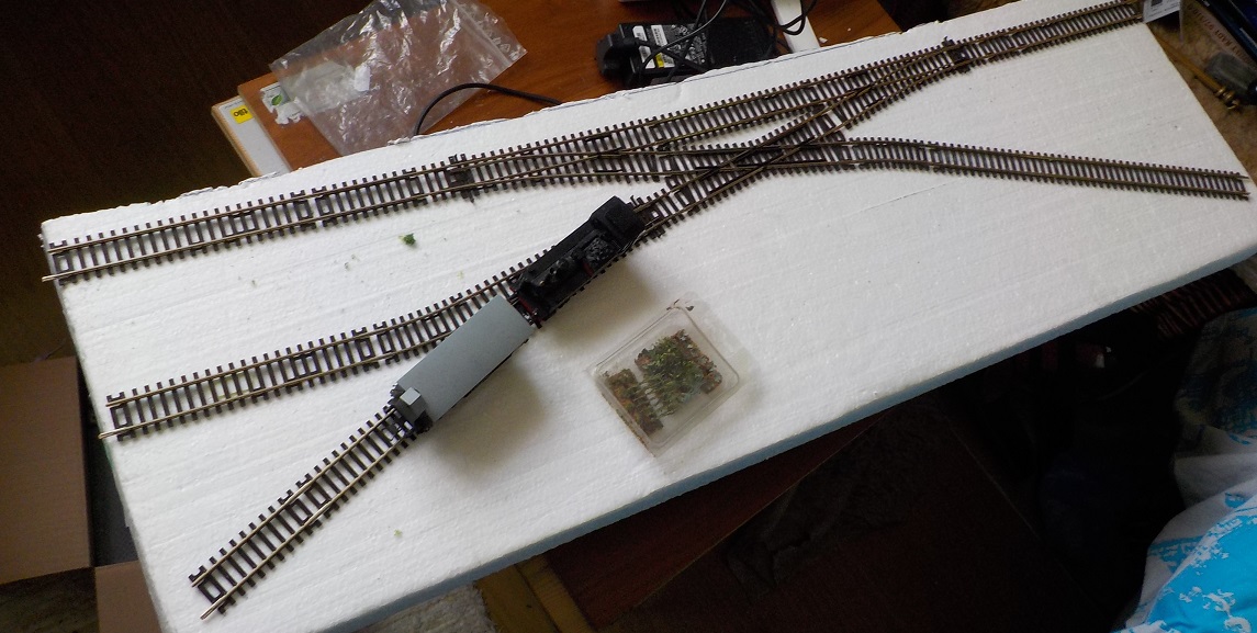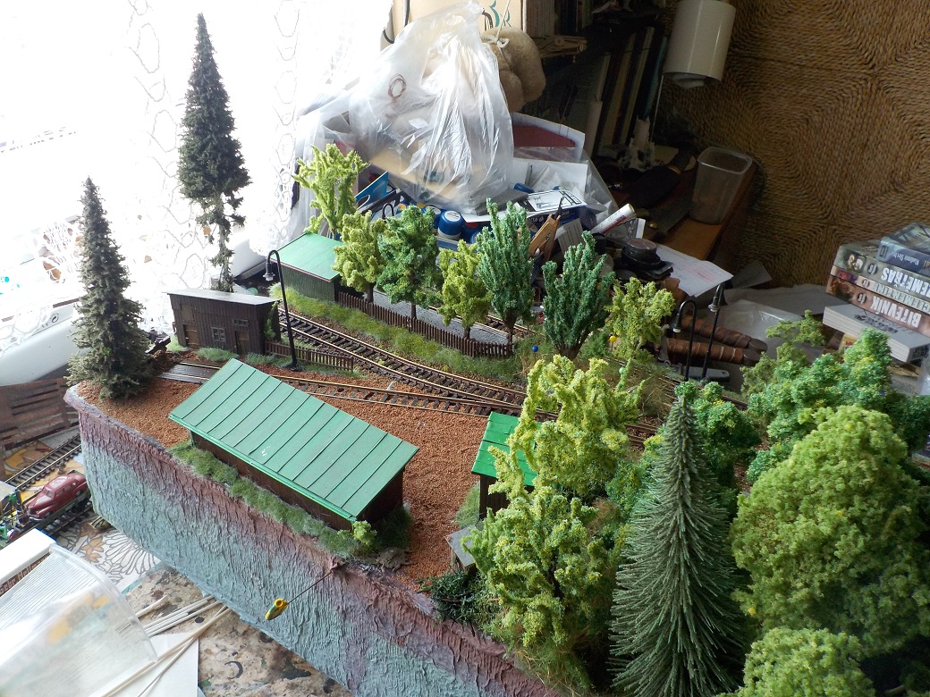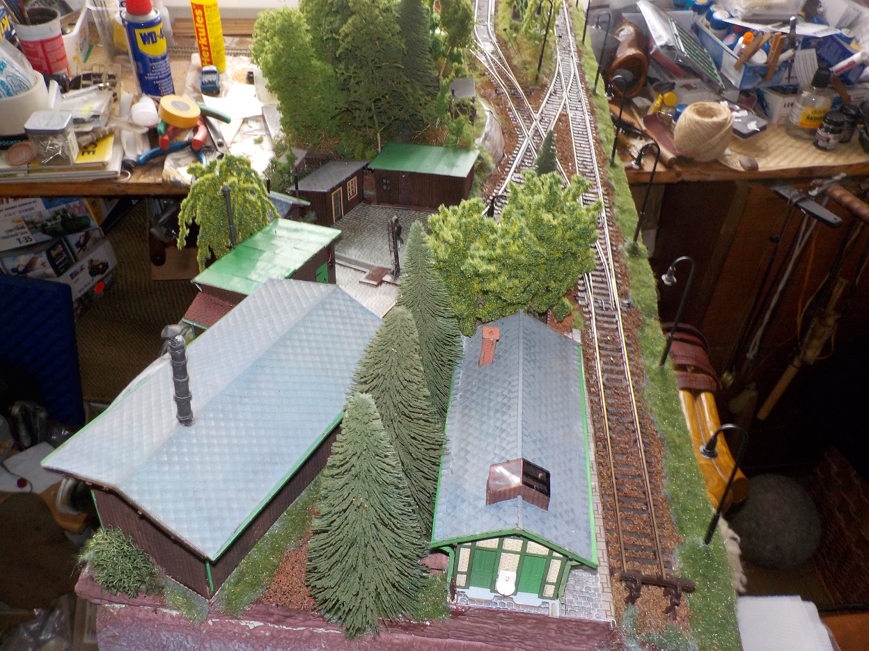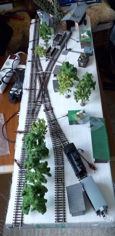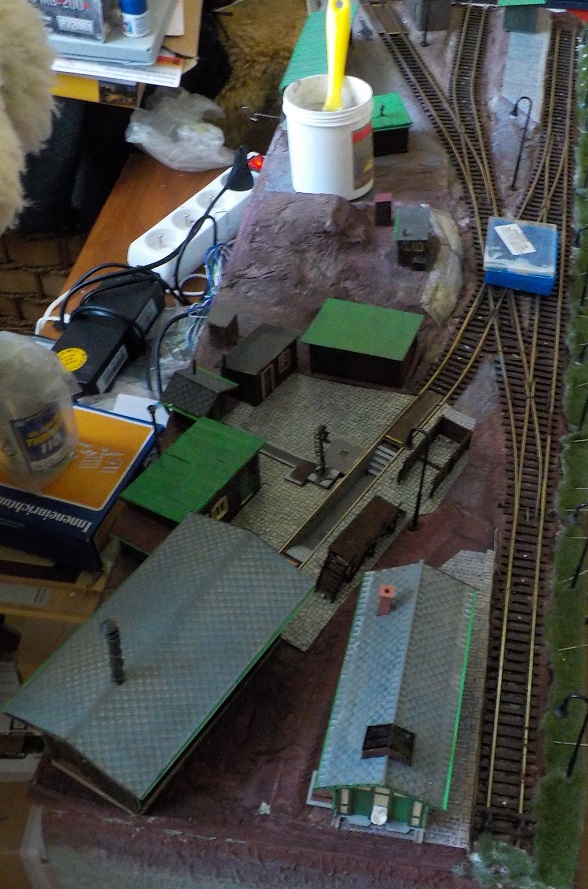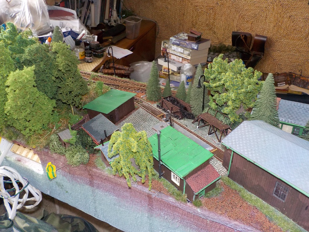 Stavby jsou víceméně zkompletované (dvě příliš "průhledné" boudy budou potřebovat naznačit interiér), chybí zásoba vhodných stromů a křovisek pro roli kulis. Fabričku z plánku nahradí traťovka, strojovou stanici tvoří dřevěné boudy a kůlny, u křížení je malé stavědlo (z odlitku) a v pravém rohu budova zastávky. Vzhledem k industriálnímu charakteru mé sady šoupališť bude i osvětlení spíše průmyslového než drážního charakteru. Většina tohoto kolejiště je koncipována na jednu lokomotivu a jeden vůz, zatímco zbytek šoupaliště je na lokomotivu a dva vozy - po příjezdu z šoupaliště tedy bude nutno jeden vůz "odložit" ke traťovce (vejde se tam buď lokomotiva s vozem, nebo dva vozy), pak pokračovat k zastávce, odtud zbylý vůz odložit do protilehlého šturcu a pak zajet do výtopny. V případě závozu uhlí souprava pokračuje do výtopny celá. do budoucna se předpokládá na celé dráze provoz samostatného "věžáku" pro osobní dopravu a dvou lokomotiv + cca osmi vozů pro nákladní dopravu. Do vzdálenější budoucnosti plánuji na střídačku jeden díl s výhybnou.