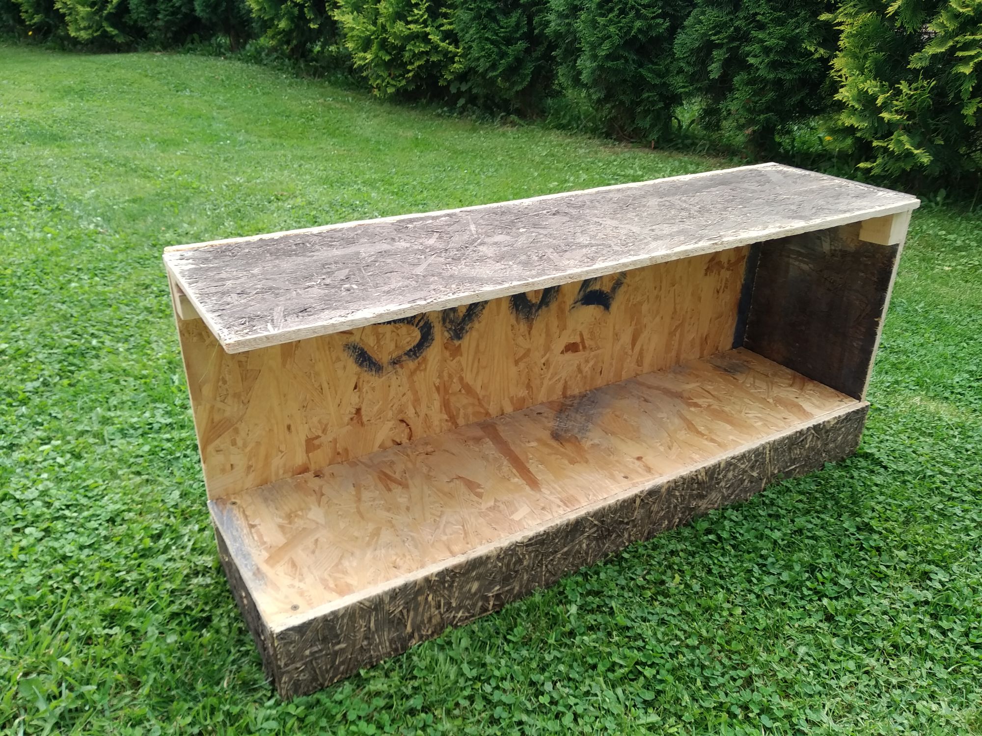 Kolejiště se bude skládat ze tří segmentů o délce 900mm. Samozřejmě se bude recyklovat. Ze starých garážových vrat je použita osb deska 8mm a protože mašinky budou jezdit v garáži, tak chci mít vše kryté. Takže vznikla takováto škaredá bedna: