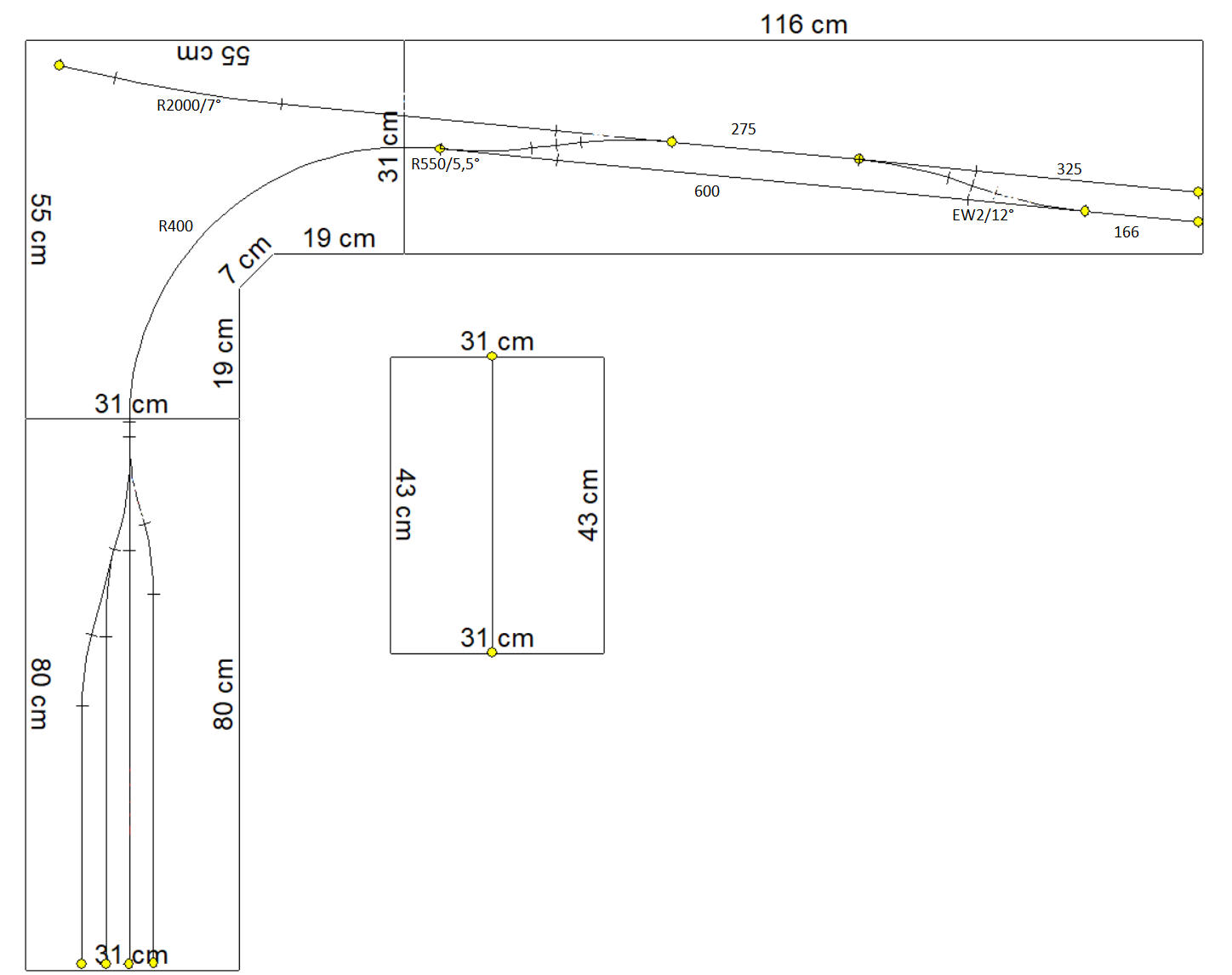Na uvedeném plánku jsou myslím všechny podstatné míry a parametry, co by vás případně mohly zajímat. Prvotní myšlenka počítá se třemi segmenty - ZNK, traťový segment s vlečkou, otevřené skryté nádraží (dále jen OSN