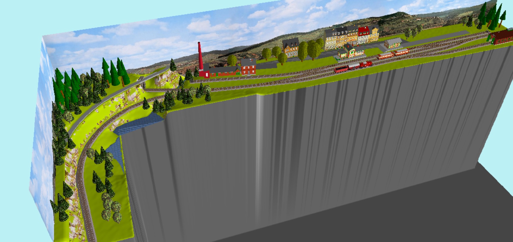 Viditelná trať před stanicí vede podél opěrné zdi, na které bude silnice, nějaké 3. třídy. Ta vlastně bude dělat kulisu, za kterou je schovaná ta druhá trať.