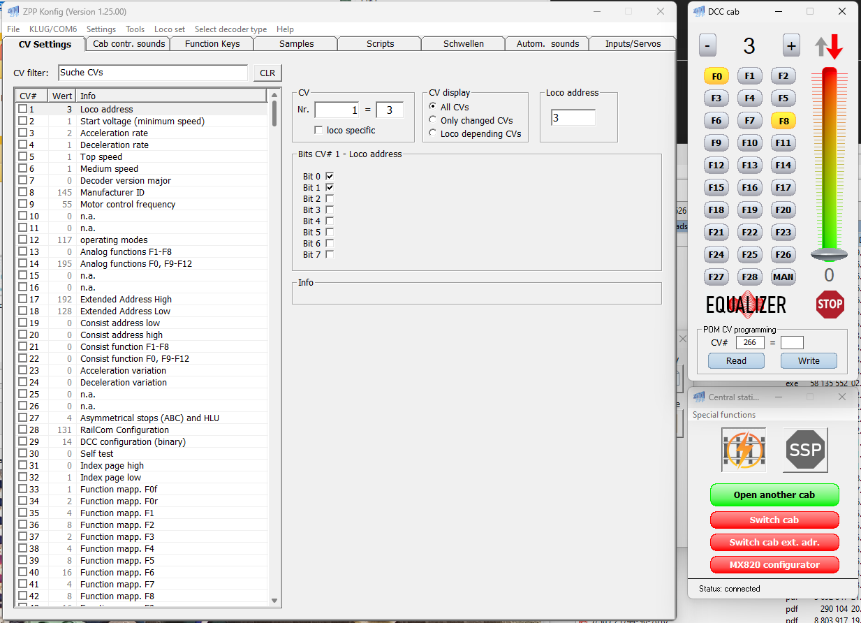 Mno, já teda tak spokojenej nejsem.. Přímo MX dekodér v konektoru identifikuju, načtu.. Víc jsem s ním provádět zatím nezkoušel.. Ale přes kolej, ani ťuk.. Connection failed.. Nevyčtu ani typ dekodéru, ani výrobní číslo.. Stolní PC, notebook, dva USB kabely, dvě loko.. Ať dělám co dělám, přes kolej se nespojí.. Přitom z programu spustím zvuk v loko atd, takže nějaká komunikace probíhá.. Párkrát se mi stalo, že se mi objevila v menu i třetí možnost výběru(detekce dekodéru) "rail MX", vůbec netuším, jak to vzniklo, ale většinou mám jen dvě - SUSI a rail MS.. Tu rail MX už mi nenabízí..