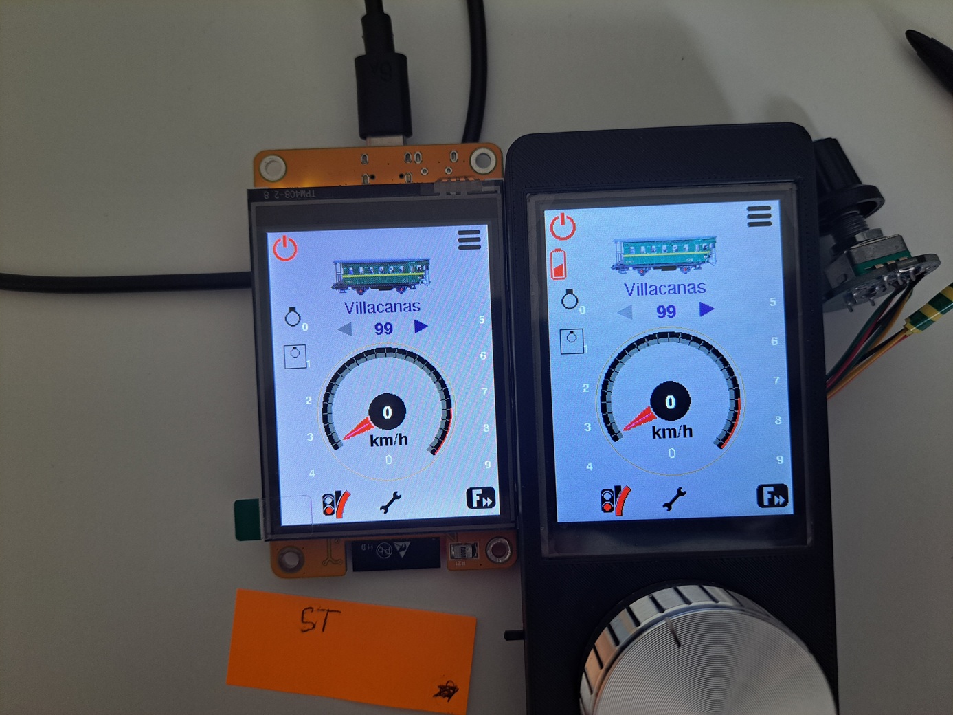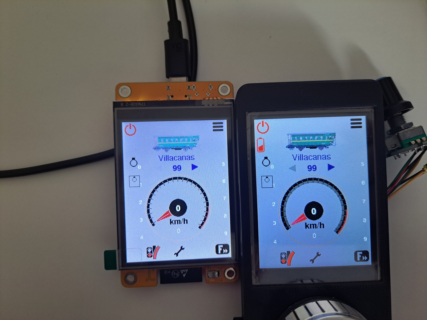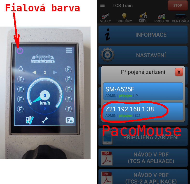 Bohužel mi nejde v PacoMouseCYD vybrat lokomotivu a rozjet ji. Patrně si ne úplně dobře rozumí s mojí centrálou TCS-2. V centrále je PacoMouse vidět jako připojené zařízení. Ale na displeji svítí ON/OFF symbol fialově a nelze vybrat lokomotivu ani příslušenství.