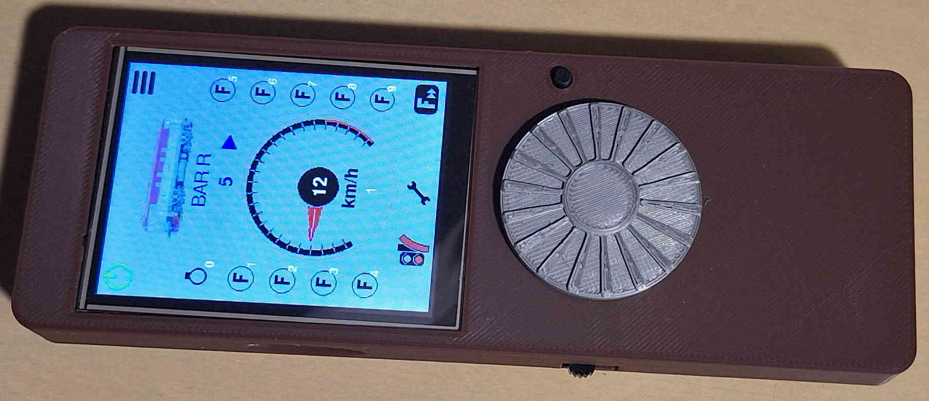 Ale nevim jestli to byl záměr, nebo to tak vyšlo při 28, první krok enkodéru = jeden stupeň, a hned naskočí 12km/h, a ručička na čtvrtce dráhy (na obrázku). Pak kroky/stupně, skáčou po 2 až 3km/h. Tak to je když je nastavená max rychlost 100km/h.