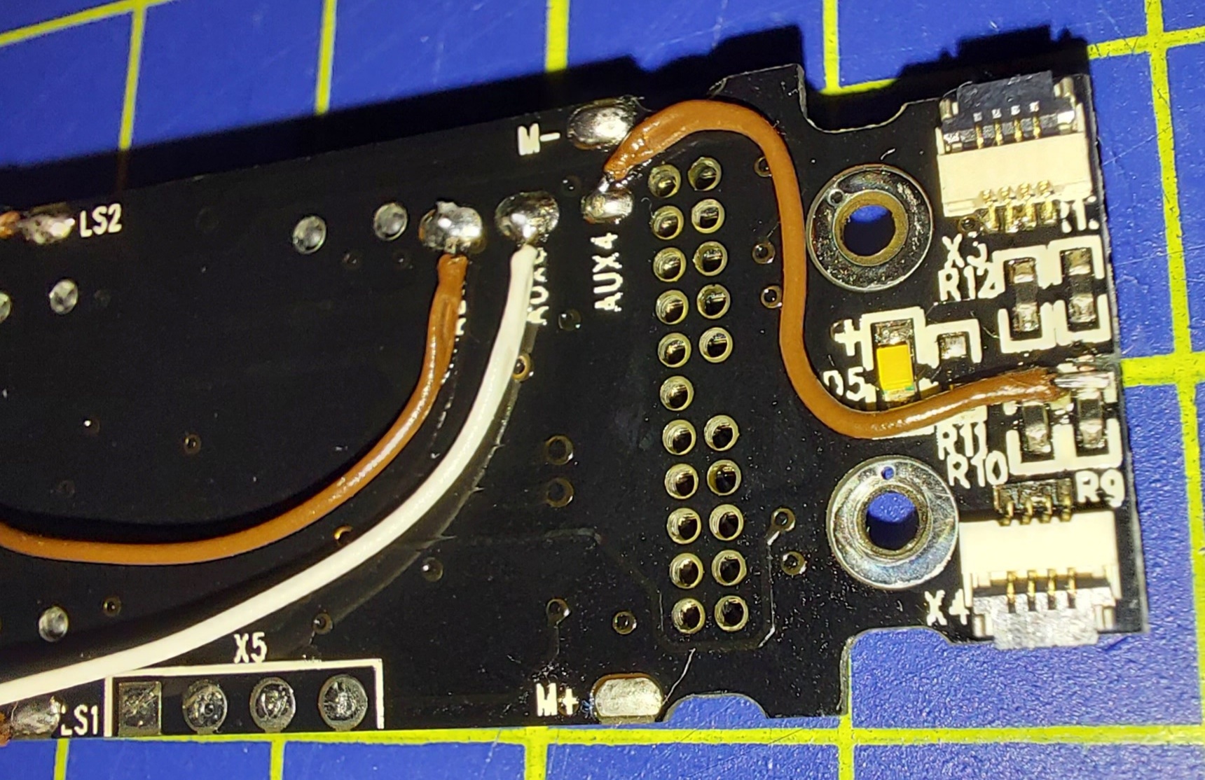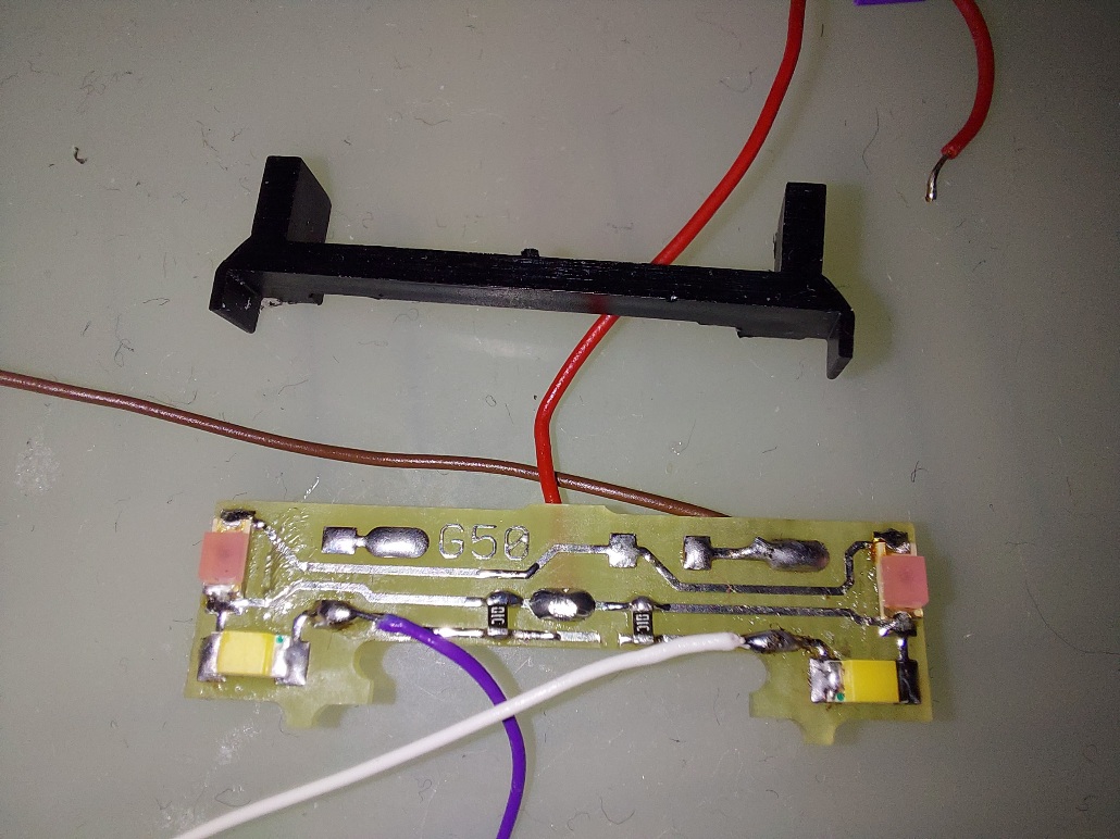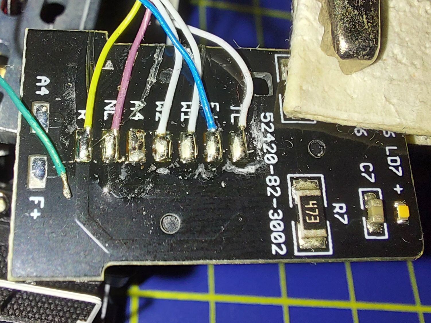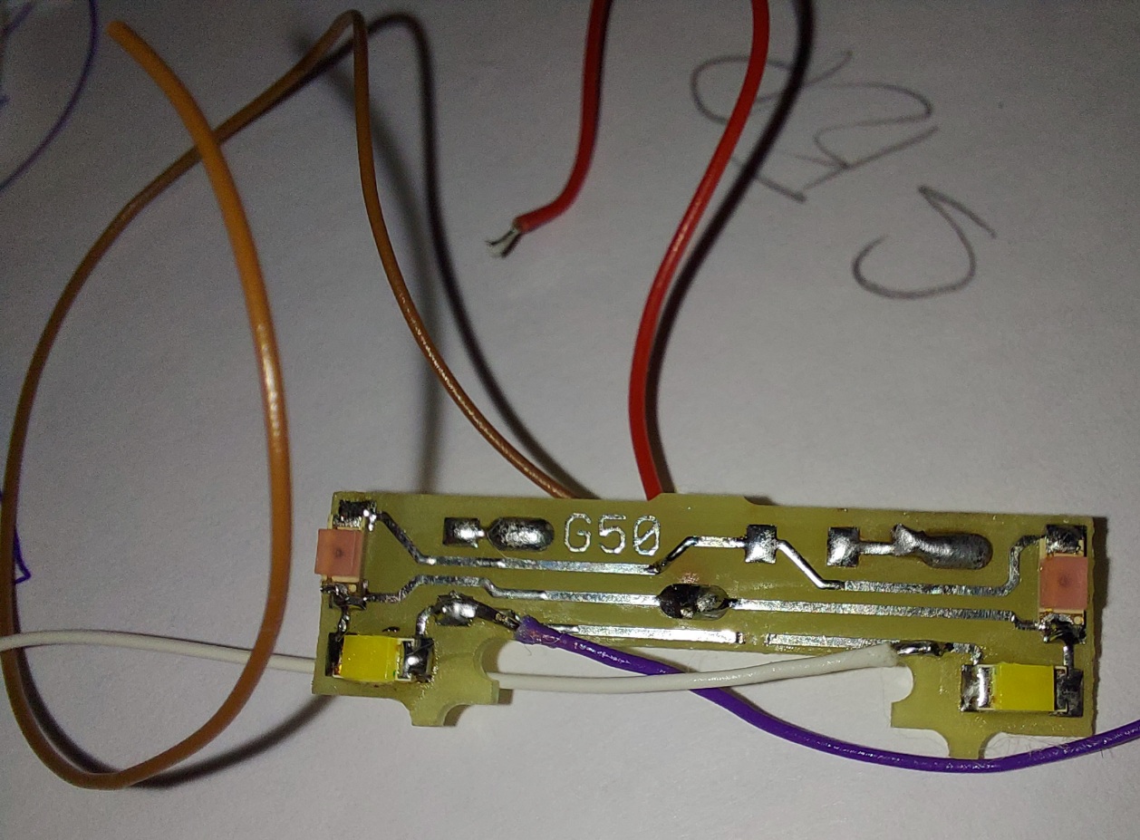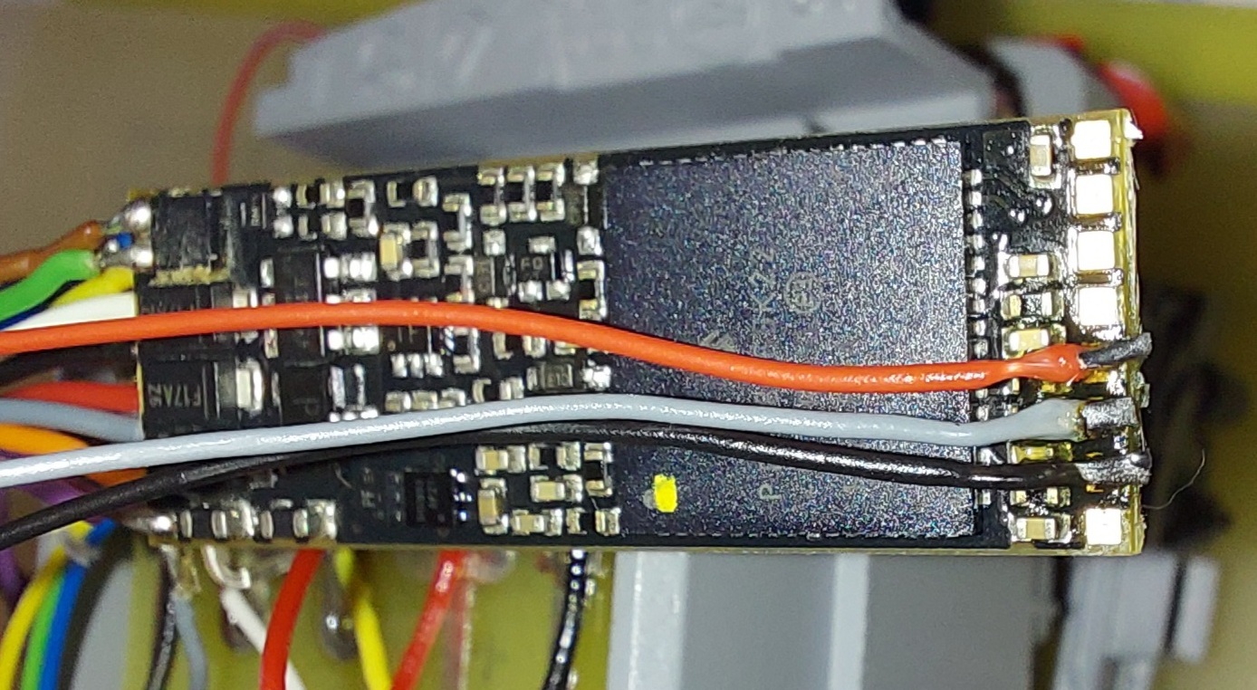 Nato aby to fungovalo, tak som musel z dekodéra vytiahnuť 3 vodiče: SUSI C, SUSI D, GND a následne dekodér zafúknuť do zmršťovačky. Hlavnú DPS som kompletne "očistil" od súčiastok včítane začiernenej žiarovky (tepelne závislý odpor). Ostala iba LED reflektora, ale bez odporu. Na miesto pripojenej žiarovky prišla prepojovacia klema. Čelné DPS s LED som taktiež "očistil" od všetkých odporov a vodičov. Jediný čo zostal bol spoločný (+) pól. Nachystal som si nové dlhé vodiče pre pravé svetlo (modrý/fialový), ľavé svetlo (žltý/biely), červené svetlá (zelený/hnedý). Reflektorové LED dostali tiež nové vodiče (šedý/čierny). Poradie farieb je uvedené pre zadné/ predné čelo. Jednotlivé vodiče som vyzväzkoval aby na DPS nebolo seno a pripojil na pomocnú DPS. Silové výstupy Fo0f a Fo0r som prepojil zo základnej DPS na pomocnú. Zelený vodič (červené sv.) som pripojil na rezervný PIN pätice 8-PIN. Hnedý vodič dekodéra som spojil s hnedým vodičom od druhých červených svetiel. Ešte som pripojil na pomocnú DPS dopĺňané vodiče z dekodéra SUSI C (čierny) a SUSI D (šedý) + GND (oranžový). Na záver som po naprogramovaní CV a odskúšaní výstupov odmeral prúd a napätie na LED zrazené pomocou trimra tak, aby LED adekvátne silno svietila a "žrala" čo najnižší prúd. Následne som osadil pevné odpory. Tiež aj pre červené svetlá na čelnej DPS. Došolichal som švajčiarske mapovanie aby bolo všetko tak ako má byť.