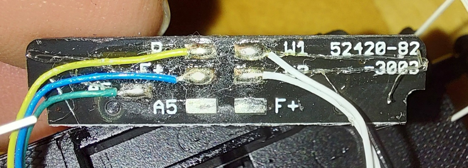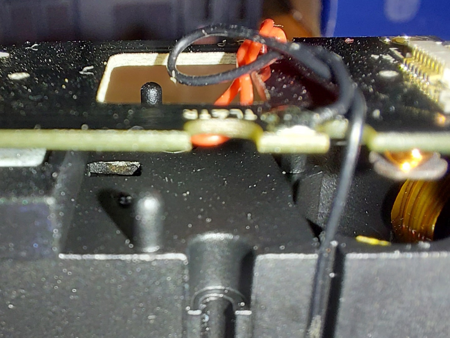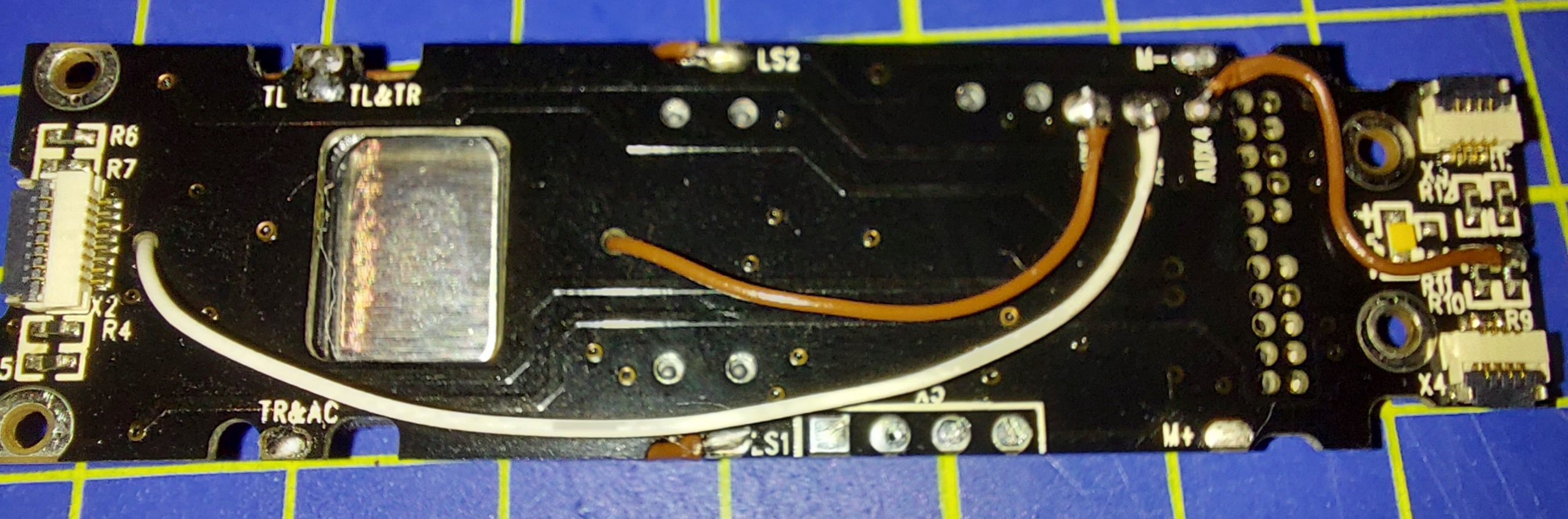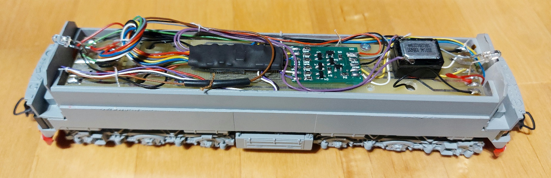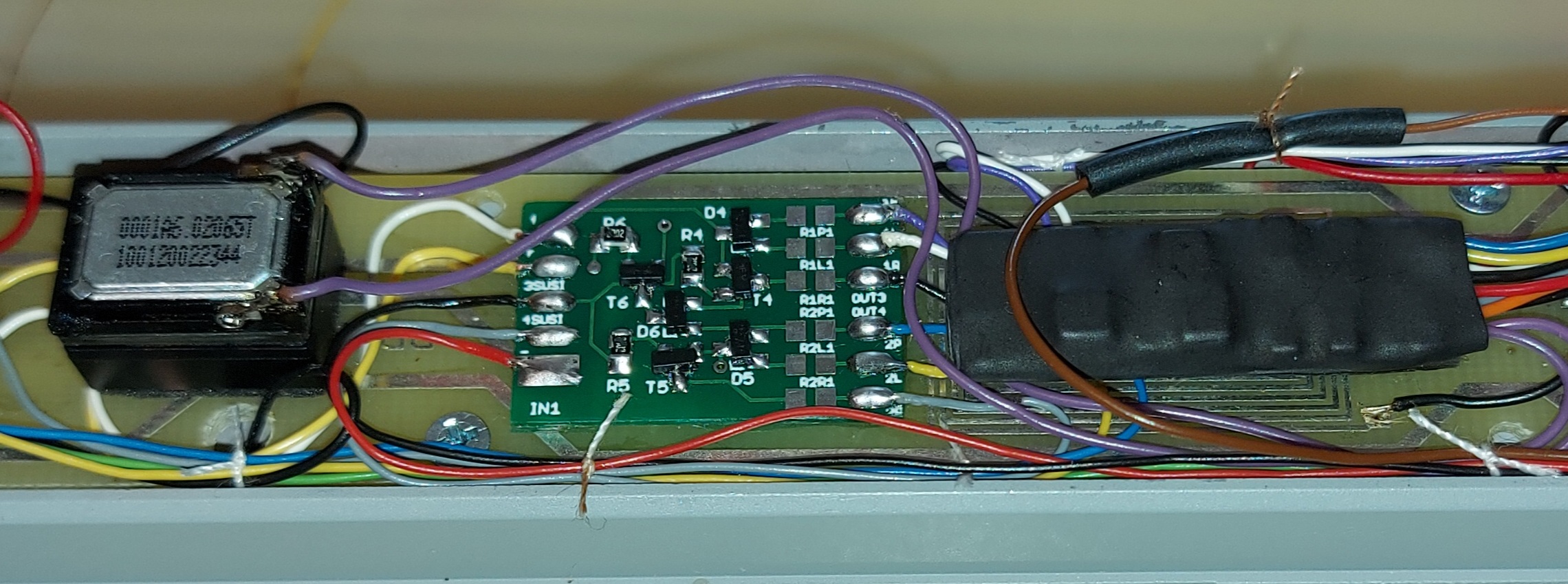 Nato aby to fungovalo, tak som musel z dekodéra vytiahnuť 3 vodiče: SUSI C, SUSI D, GND a následne dekodér zafúknuť do zmršťovačky. Hlavnú DPS som kompletne "očistil" od súčiastok včítane začiernenej žiarovky (tepelne závislý odpor). Ostala iba LED reflektora, ale bez odporu. Na miesto pripojenej žiarovky prišla prepojovacia klema. Čelné DPS s LED som taktiež "očistil" od všetkých odporov a vodičov. Jediný čo zostal bol spoločný (+) pól. Nachystal som si nové dlhé vodiče pre pravé svetlo (modrý/fialový), ľavé svetlo (žltý/biely), červené svetlá (zelený/hnedý). Reflektorové LED dostali tiež nové vodiče (šedý/čierny). Poradie farieb je uvedené pre zadné/ predné čelo. Jednotlivé vodiče som vyzväzkoval aby na DPS nebolo seno a pripojil na pomocnú DPS. Silové výstupy Fo0f a Fo0r som prepojil zo základnej DPS na pomocnú. Zelený vodič (červené sv.) som pripojil na rezervný PIN pätice 8-PIN. Hnedý vodič dekodéra som spojil s hnedým vodičom od druhých červených svetiel. Ešte som pripojil na pomocnú DPS dopĺňané vodiče z dekodéra SUSI C (čierny) a SUSI D (šedý) + GND (oranžový). Na záver som po naprogramovaní CV a odskúšaní výstupov odmeral prúd a napätie na LED zrazené pomocou trimra tak, aby LED adekvátne silno svietila a "žrala" čo najnižší prúd. Následne som osadil pevné odpory. Tiež aj pre červené svetlá na čelnej DPS. Došolichal som švajčiarske mapovanie aby bolo všetko tak ako má byť.