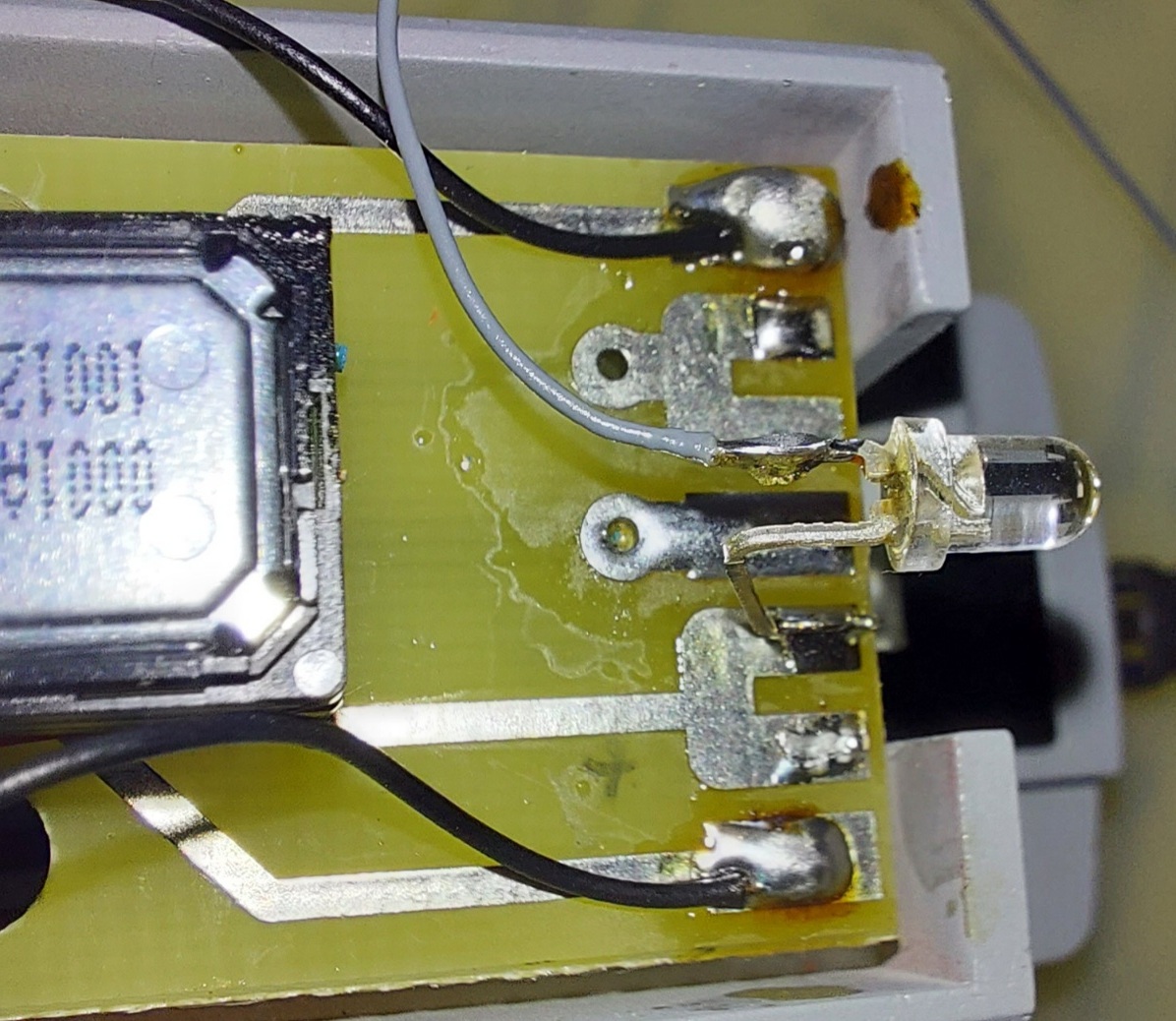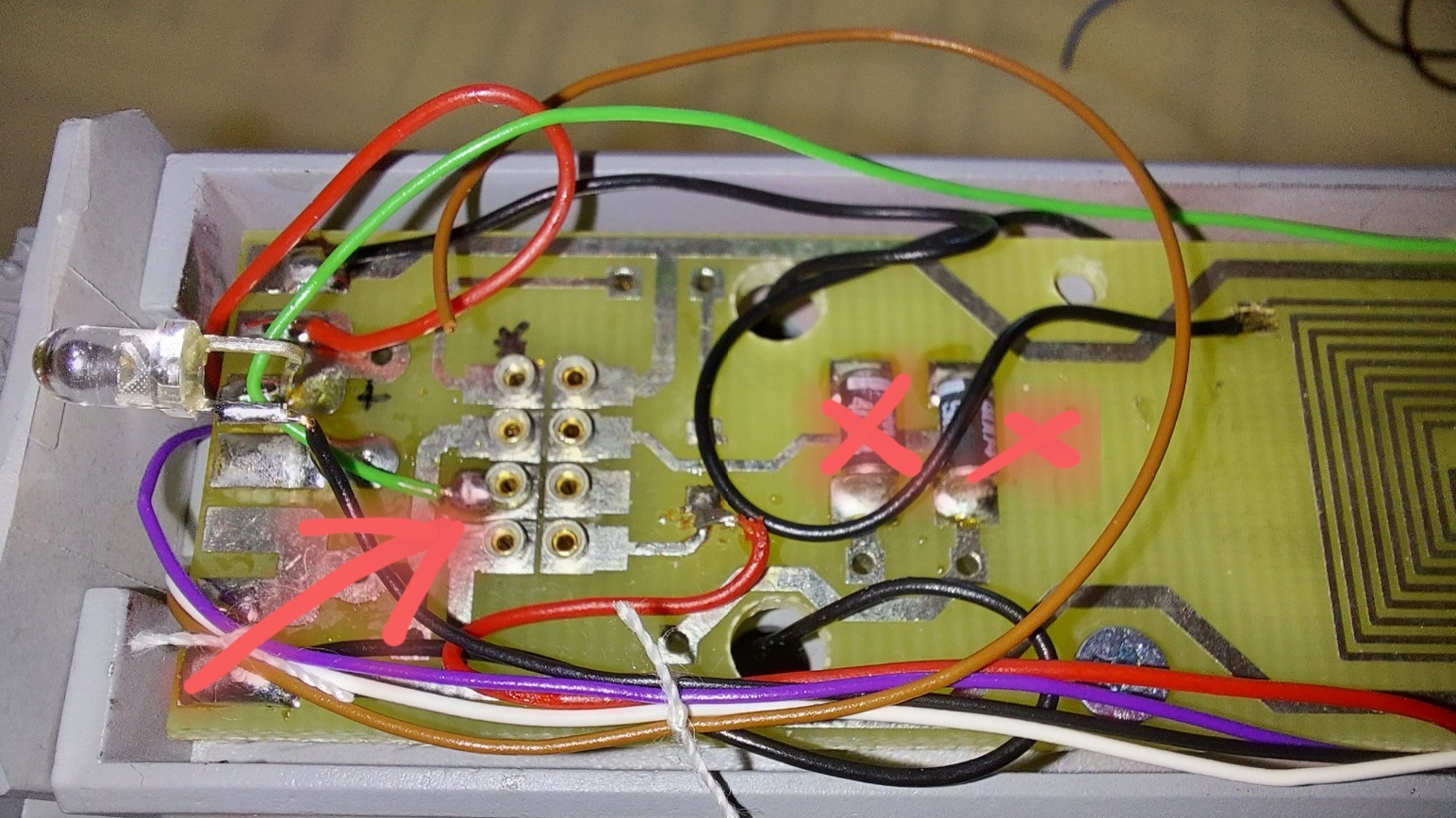- Osadená DPS, zatiaľ bez odporov pre LED [kto bude pozorne sledovať zapojenie na DPS, tak zistí, že je tam niečo divné... Zistil som, že pri kreslení v EAGLI som si vybral zlé púzdro SOT23-EBC - tranzistor som musel osadiť dole označením typu. Tu na obrázku je to v stave, keď som o tejto chybe ešte nevedel.]