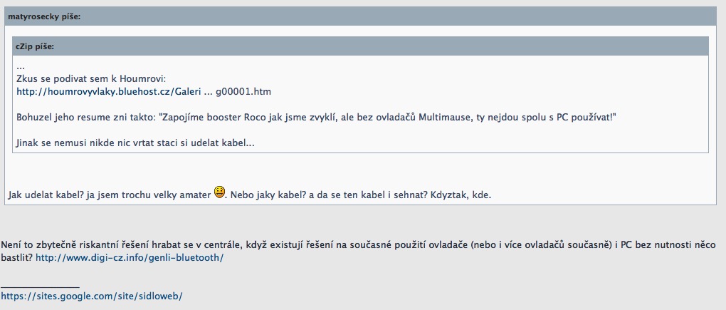 Uvedenou adresu se mi nepodaŕilo otevřít. Problémů je několik, za prvé jak propojit centrálu s PC, za druhé jak propojit centrálu s jednotlivými prvky, za třetí jaký použít ovládací software. Pokud by šlo jen o jednoduché ovládání výhybek, je možné použít třeba centrálu Roco z21 a výhybky ovládat z tabletu nebo smartphonu. Pořád ale zůstává nezbytnost pořízení dekodérů pro ovládání přestavníků výhybek. Obávám se ale že představa jednoduchého a levného řešení se základní "centrálou Roco" je zcela mimo realitu.