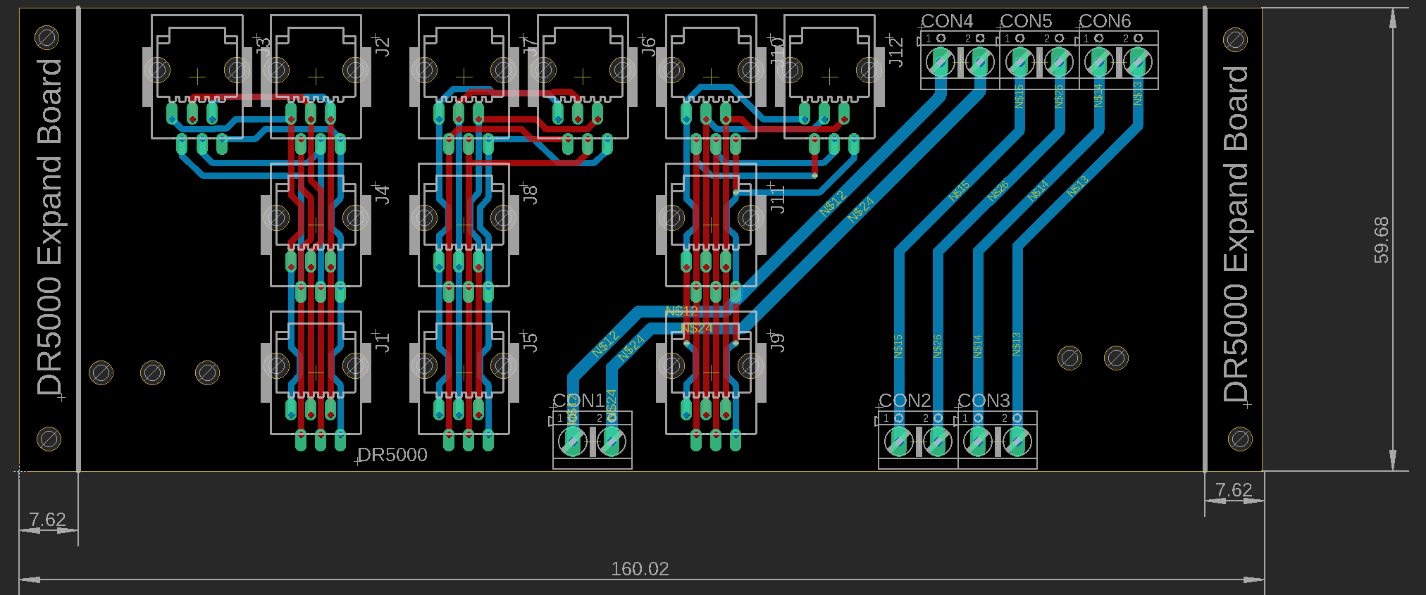 Ty konektory RJ směrem ven bych nedával až k hraně dps. Nechal bych tam 10-15 mm na možné upevnění kabelů, aby nebyly konektory mechanicky namáhané. A vodiče Track pro napájení kolejiště co nejsilnější.