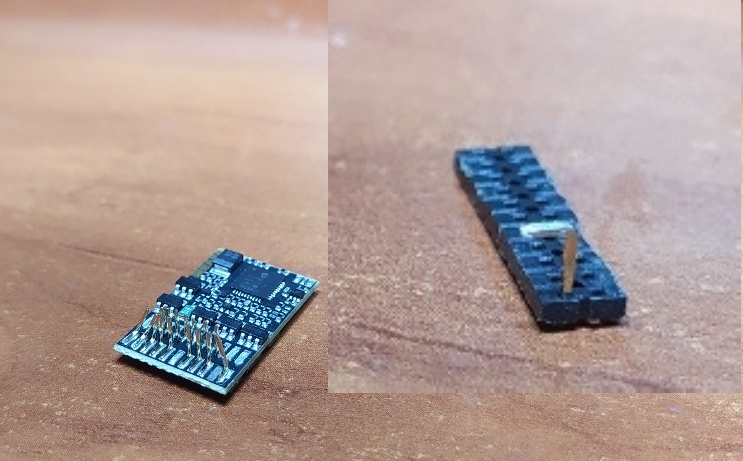 no, hnědá kostička, čtvereček. Předtím byl asi černej, to by mohl být. Já jsem to závaží v hektorovi vyříznul tak aby tam byl dekodér volně a ještě jsem na závaží nalepil isolačku. Jinak v desce toho hektora pmt ta patice je dost na prd. Musel jsem ohnout všecky piny, aby vodily pořád. Pěkná pakárna. A nebo jsou ty piny krátký....každopádně já ten dcc mám trochu jinej ne na drátech, bez isolace