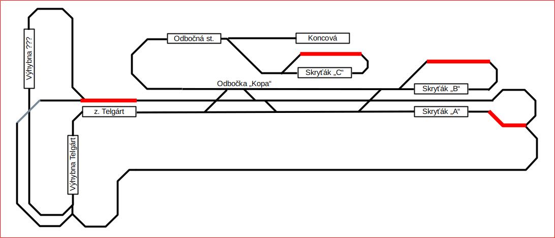 @Pater: prislo mi, ze na Tvem reseni (a puvodnim Zdenkove + doplnene trate) je uzavreny kruh Skrytak "A" - Kopa - Telgart - Skrytak "A", ze bych bylo vhodnejsi to riznout tak aby trate nikde kruh (bez preruseni smyckomodulem) netvorily. Proto premisteni smycky do spolecneho useku vc. vyhybky. Ale mozna to je zbytecne / prekombinovane.