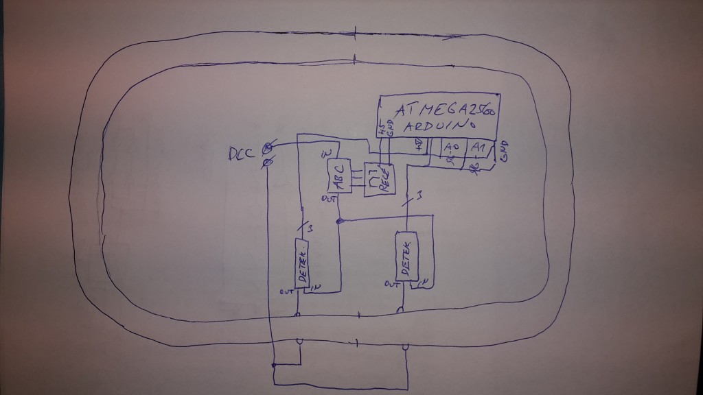 V Arduinu je program, kdy testuje obsazení 2 úseků. Pokud vjede vlak do levého, tak arduino přeruší přemostění ABC. Vlak zastaví a po 2 minutách se přepne relé zpět a vlak jede vstříc zastavení :D a tak dokola.