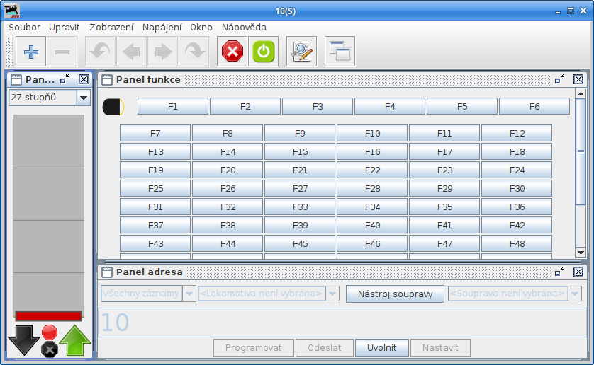 2. Předpokládám, že se to povedlo. Na koleje dám mašinku s dekodérem MN300. V menu DecoderPro ⇒ Akce ⇒ Nový ovladač otevřu okno s ovladačem JMRI. Do pole adresa zadám adresu lokomotivy (to je ta z multiMAUS). Kliknu na Nastavit a adresa zešedne. V příkladu jsem použil adresu 10. Potom levým šoupátkem zkusím mašinku rozjet.