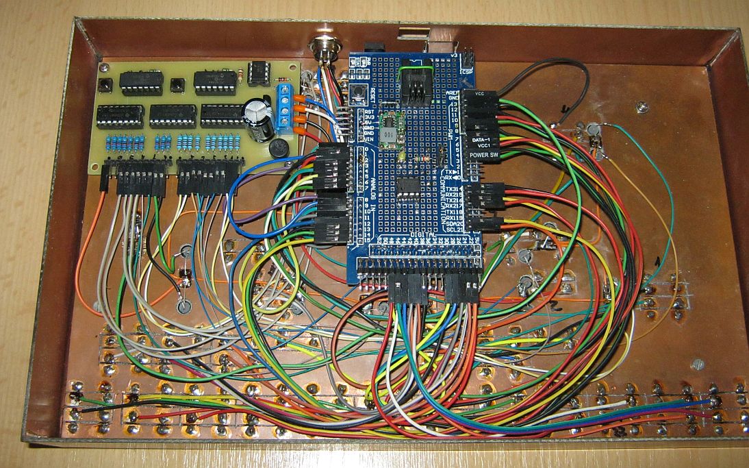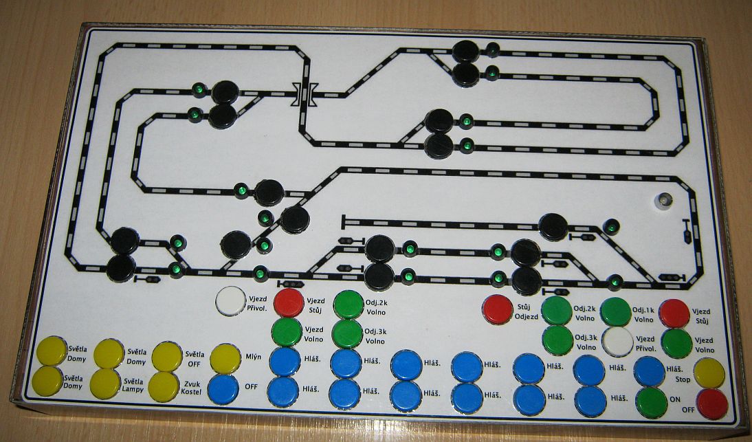 Také právě dokončuji panel pro své kolejišťátko. Vzhledem k počtu potřebných součástek jsem ovládání jsem řešil pomocí arduina mega podle Martina (BorgM). Oproti klasickému (Pacovu) TCO není třeba na každý výstup diodu, nesbíhají se mi spousty drátů na jednu svorku, mám možnost stavět cesty a možnost ovládat a signalizovat stav DCC. Vzhledem ke spolehlivosti přestavníků serv jsem pro signalizaci stavu výhybek použil dekodér pro návěstidla a přiřadil stejné adresy, jako mají výhybky.