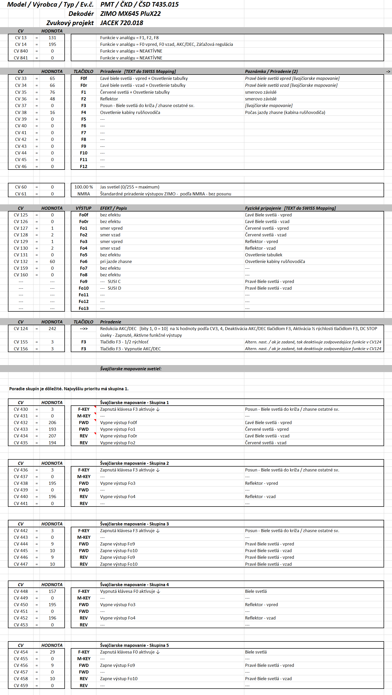 DEFAULT mapovanie (F3-posun, ½ rýchlosť, F4-deaktivácia zotrvačnosti, F5-osvetlenie interiéru, F6-Voľnobeh) som zmenil na môj štandard – uvoľnil som F4 – (F3-posun, ½ rýchlosť, deaktivácia zotrvačnosti, F4-zhasnutie zadného čela, keď je privesený vagón, F5-osvetlenie interiéru, F6-Voľnobeh). Švajčiarske mapovanie toto moje nastavenie zohľadňuje. Kto to chce mať v nezmenenom JACEK-ovom nastavení, tak švajčiarske mapovanie pre F4 jednoducho vynechá. Prípadne ešte posunie skupiny švajčiarskeho mapovania.