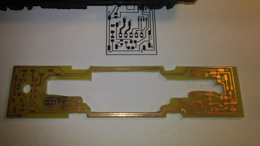 Do kastle se to vejde, kolem motorku take. Chybi nalepit kousky cuprextitu do praveho uhlu, co ponesou vlastni pozicni a koncova svetla. Ano, uz ted vim, ze ten plosnak je neoptimalni - nektere diry jsou zbytecne velke a do toho zbytecne zdevastovaneho mista pak presunu nektere kousky elektroniky - u pristiho plosnaku. Tohle zkusim dodelat, osadit a zabudovat ...