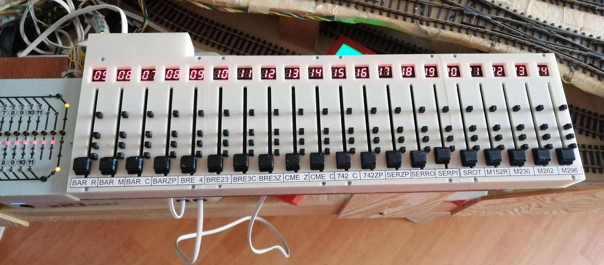 Mým šnečím tempem jsem dodělal těch naplánovaných 20 Simplemausů a udělal na ně krabičku. Délka pultíku 40 cm se dá s přehledem ovládat. Ke každému poťáku mám popisku 5 písmen, jako mám v MM, a 4 tlačítka na ovládání reverzu, funkce F0-F4, a nouzové rychlé zastavení. Pro mě lepší, než vycvakávat a hledat na displeji.