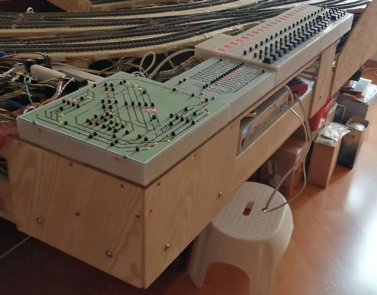 Všechno funguje a lokomotivy reagují okamžitě. Mohlo by jich být víc, ale to už by se mě nevlezlo do rohu kolejiště, kde mám taky ostatní ovládání kolejiště. Výhybková trasa odkud - kam, tlačítka pro návěstidla volno/posun, točna.