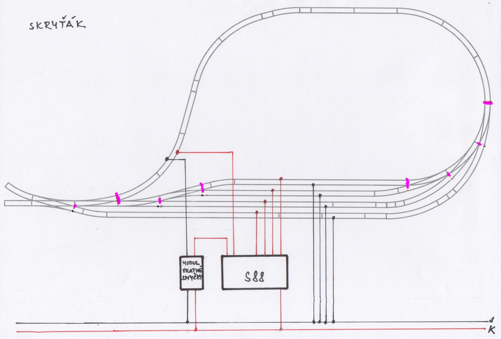 Ano, pokud máš tu samotnou vratnou kolej vzadu dost dlouhou, tak je vhodné připojit modul vratné smyčky jen na ni a skryté nádraží napájet nereverzovaným DCC signálem napojeným přímo na vjezd do smyčky. Zapojení srdcovky je správné, reverzní úsek odděl na obou kolejích kousek za srdcovkou. Modul zpětného hlášení zapoj do reverzního úseku podle návodu výrobce.