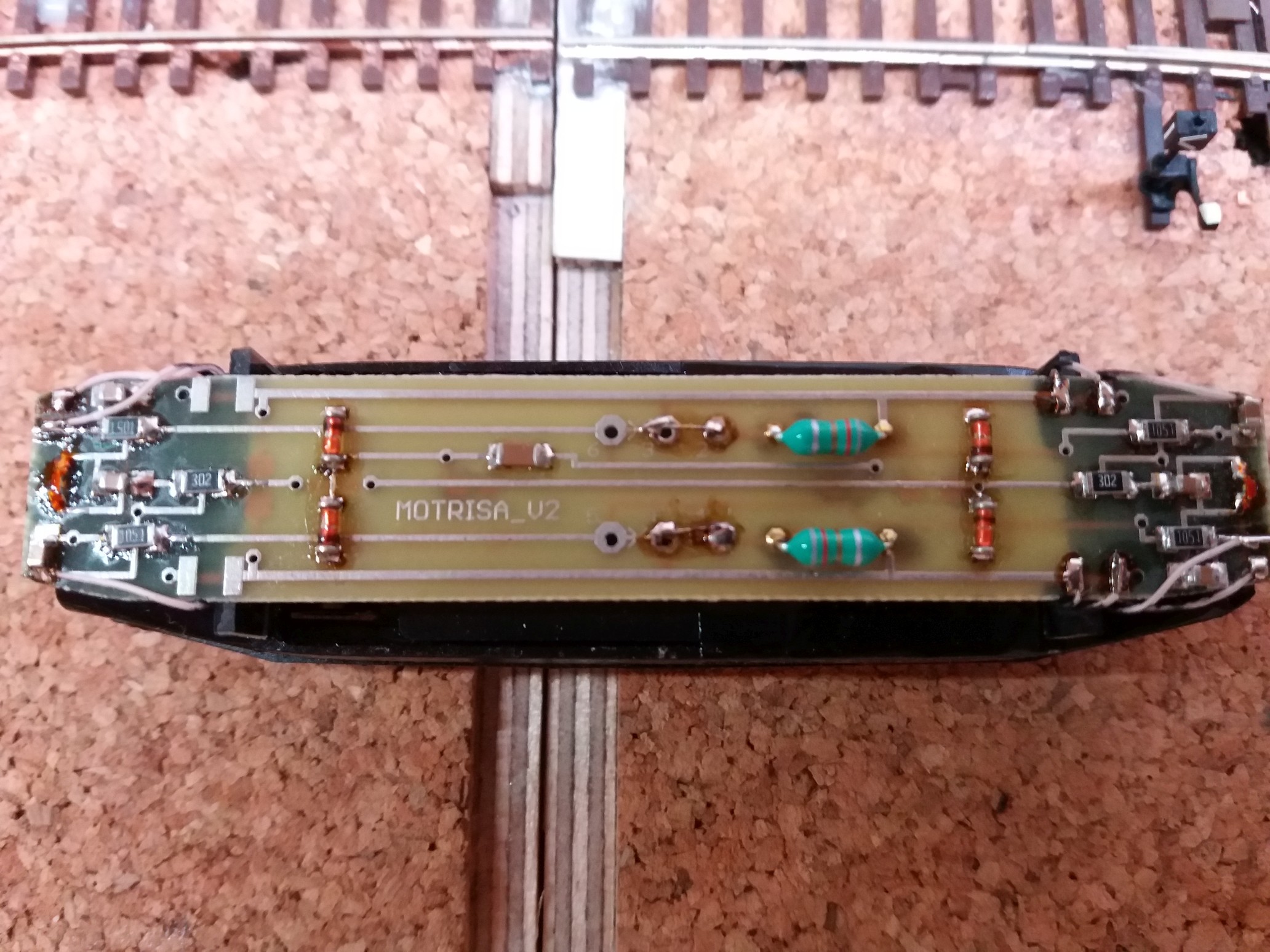 Digitalizace byla úspěšně dokončena. Po naletování vodičů dekodéru k pájecím místům a vyjmutí drátových propojek mezi 1-4 a 2-3 jsem si ještě všiml, že přímo na desce plošného spoje je propojení mezi body 3-6 a 4-5 a u těchto propojení je naznačeno, že se mají přerušit. To jsem udělal a začalo fungovat ovládání světel. Světla ale svítila opačně (dopředu červená a dozadu bílá), takže jsem ještě přehodil bílý a žlutý vodič a bylo hotovo. Motorový vůz jezdí, světla se dají zapnout a vypnout a přepínají se podle směru jízdy. Pro digitalizaci jsem použil dekodér Lenz Silver Mini Plus s vodiči.