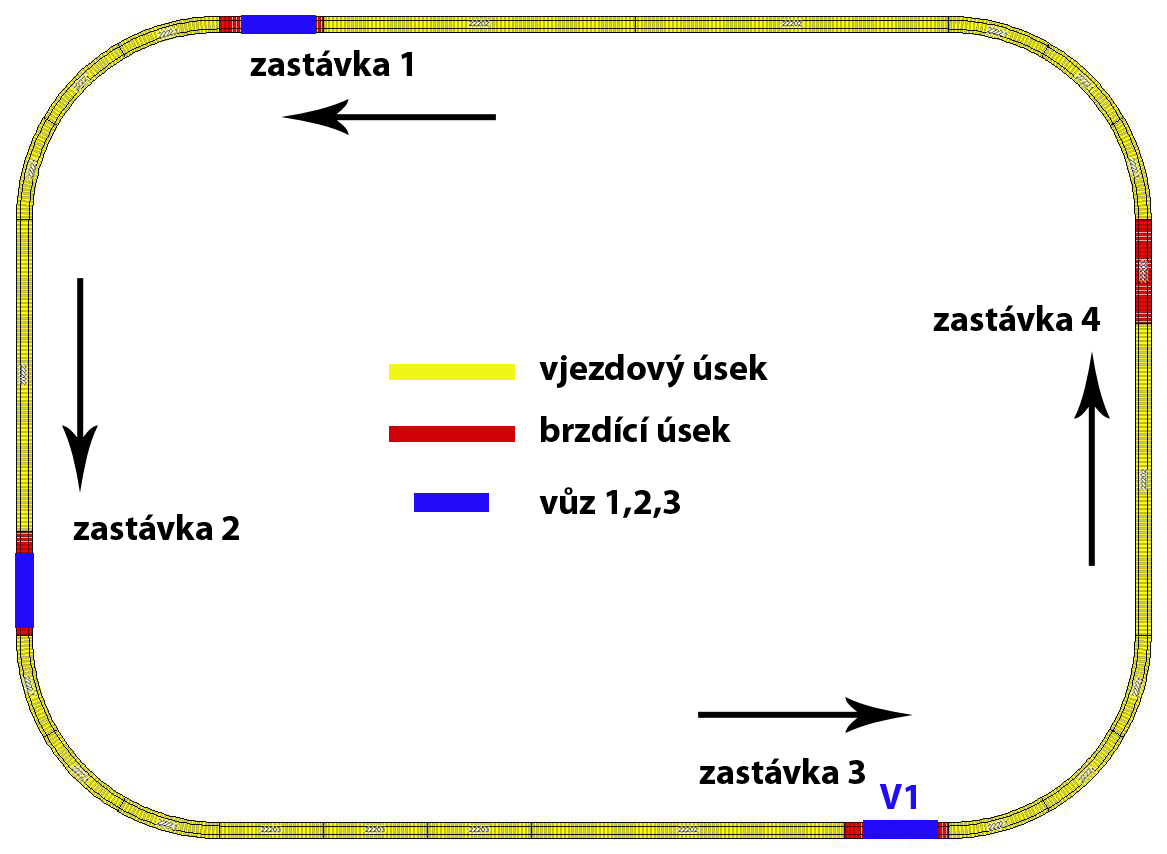 mohl by mi někdo potvrdit nebo vyvrátit moji myšlenku částečné automatizace provozu v DCC např. tramvaji na uzavřeném okruhu za pomocí modulu BM3 od Lenze. Pokud chci například v jednom směru realizovat pohyb 3 tramvají po jednotlivých zastávkách, potřebuji o 1 úsek víc, tzn. 4 viz.schéma. Z návodu chápu funkci autobloku tak, že jakmile se uvolní následující úsek (tramvaj/lokomotiva) automatický pokračuje do něj (když návestidlo neříká opak). Moje úvaha byla, že ovládám pouze jednu soupravu a ty dvě za ní se posouvají automaticky tak, jak já uvolňuji vždy předchozí úsek. Návěstidla nejsou. Je to reálné nebo jsem úplně mimo?