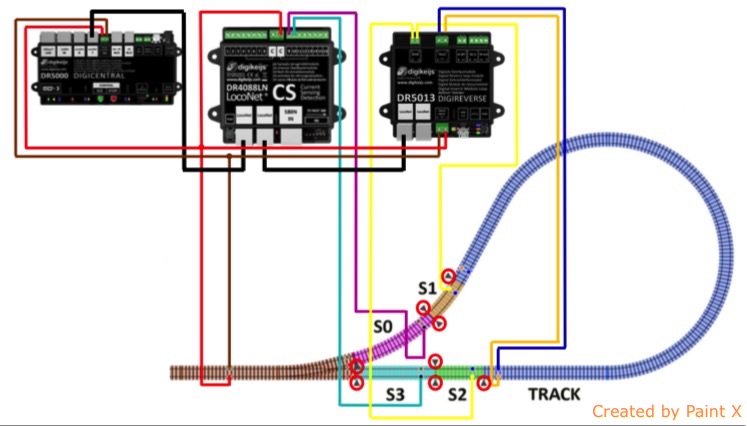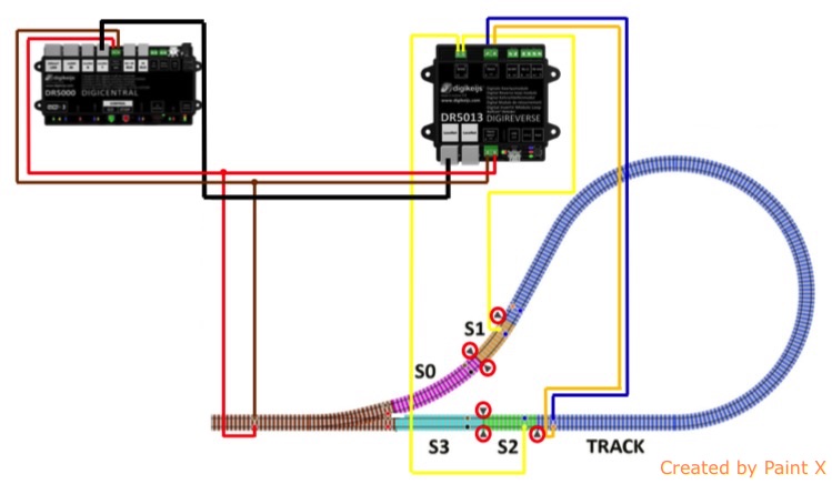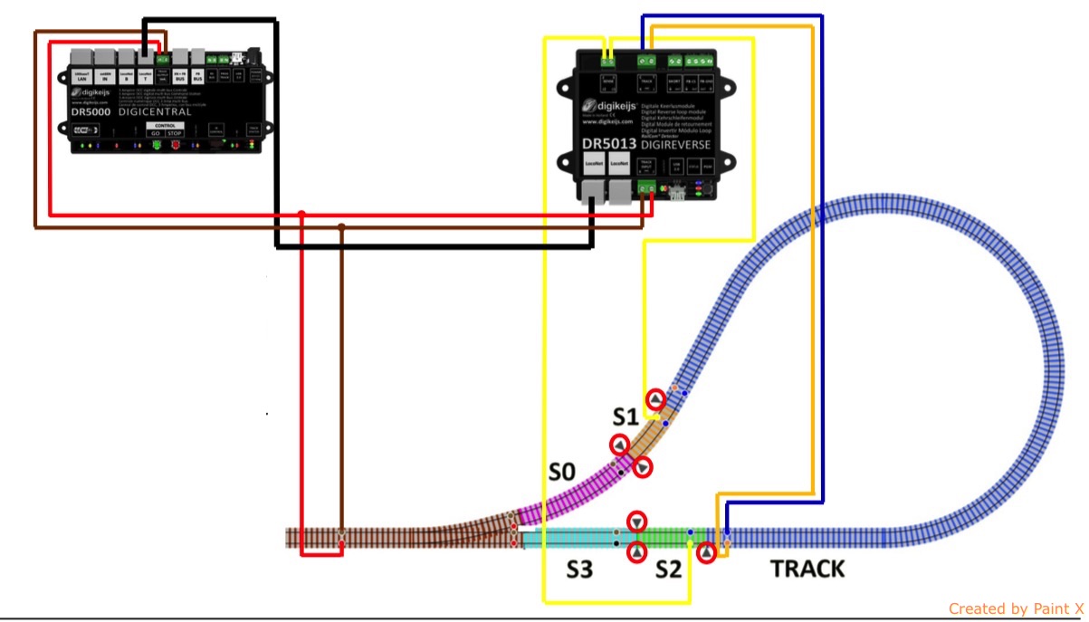 Také jsem byl zvědav, jak si modul poradí se zapojením dle obrázku 2 a 3, pokud lokomotiva zastaví v úseku S0, přehodím výhybku rovno a s lokomotivou couvnu do smyčky, která má již přehozenu polaritu. DR5013 zaregistruje zkrat a polaritu přehodí, takže ani v tomto případě nedojde k žádnému problému. DR5013 totiž může reagovat buď jen na obsazení, nebo jen na zkrat, ale umí reagovat i na obě události, což se mi jeví nejlepší.