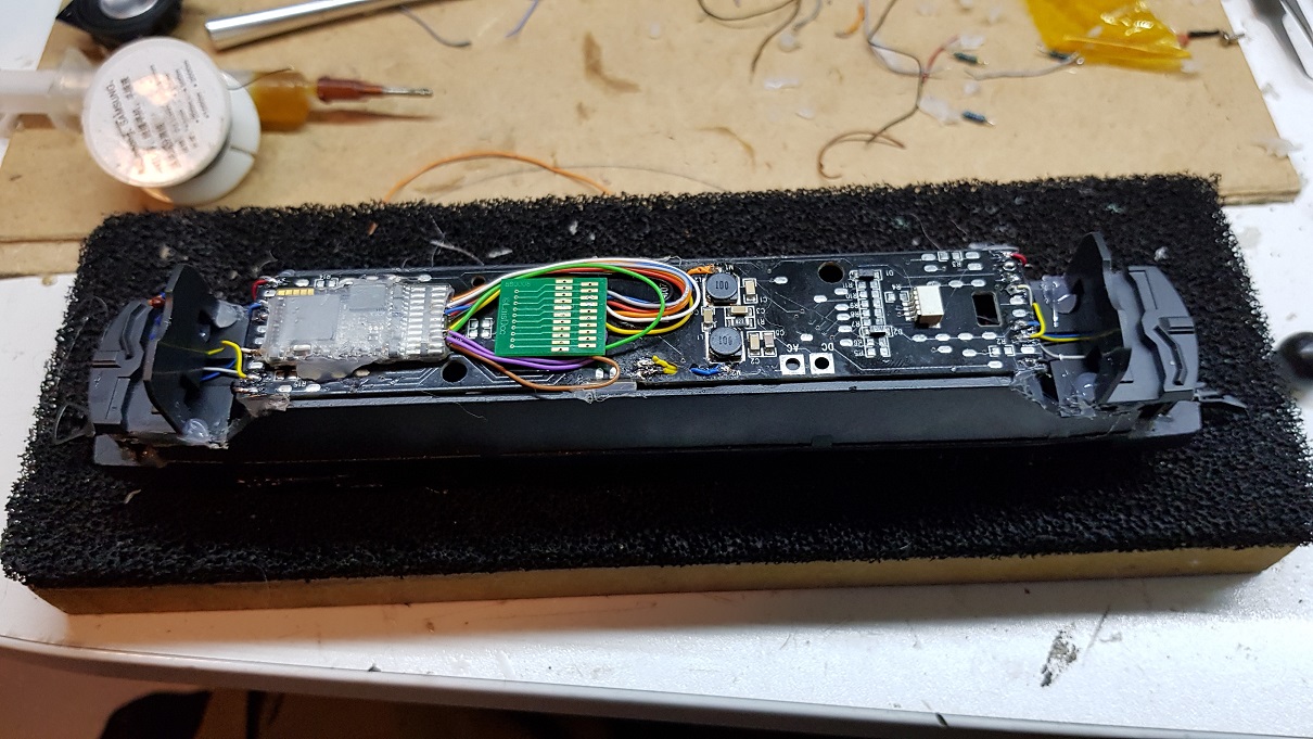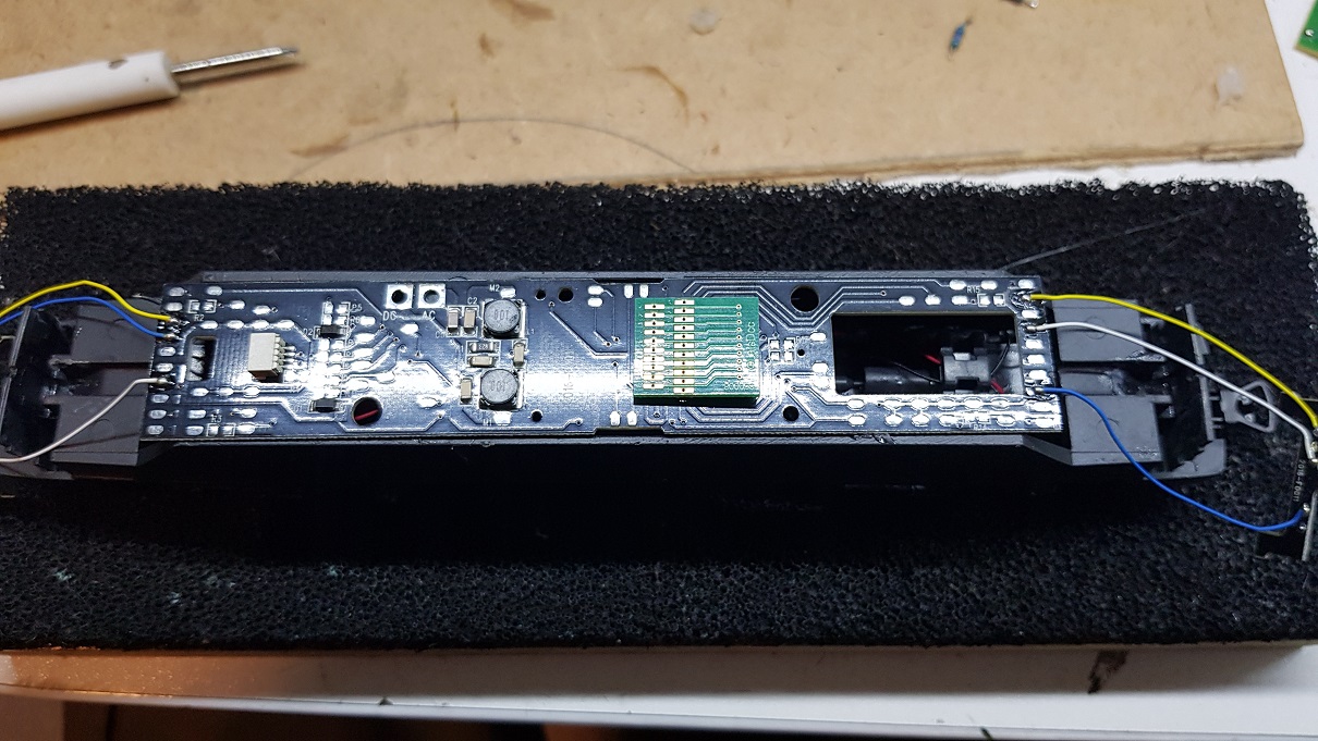 Zkušebně sem objednal desku z číny. Nechtělo se mi kupovat nový dekodér proto jsem použil stávající nem652 a pájecí redukci na plux22. Pod desku jsem dal kondenzátor i reproduktor. Prozatím mam zapojeno nezávislé osvětlení později se pustím do osvětlení kabiny a dálkových světel. Na redukci jsem musel stáhnout plast na pinech a předělat pin 11 na pin 21.