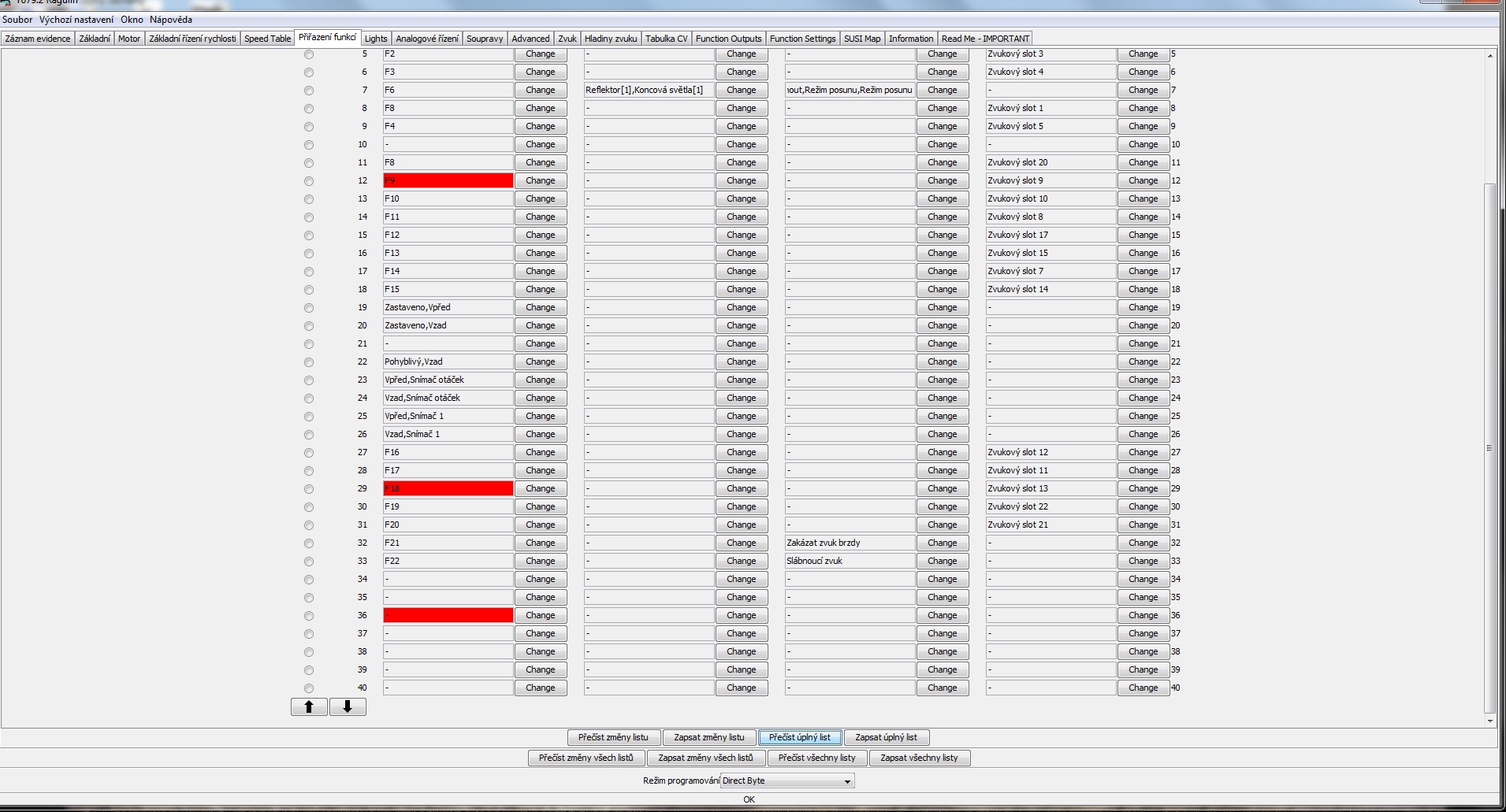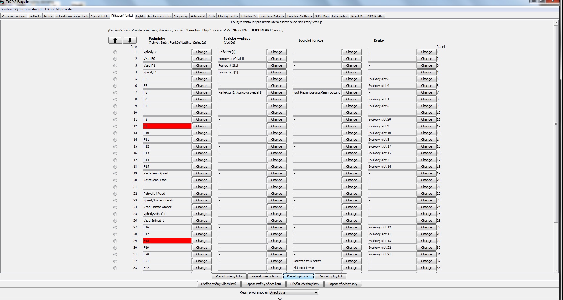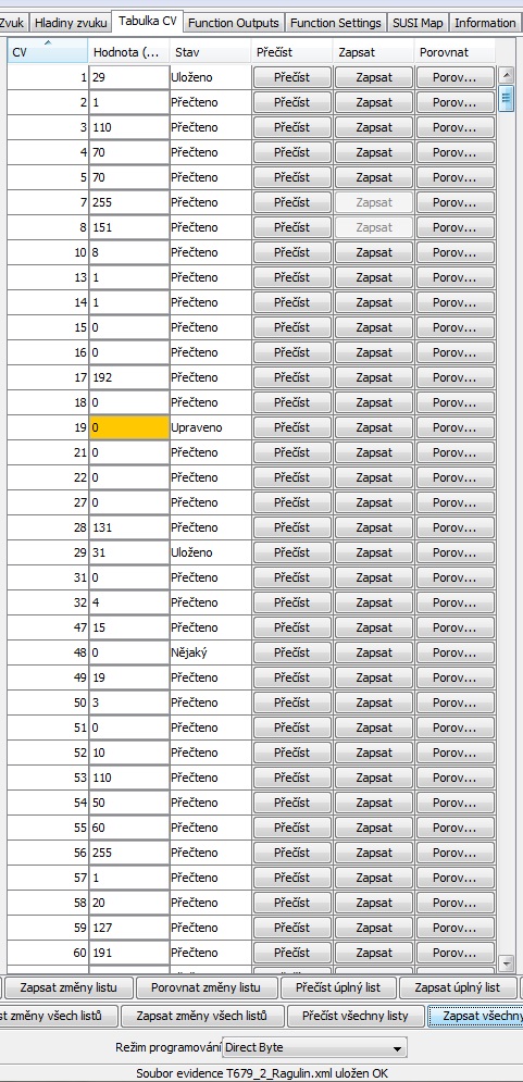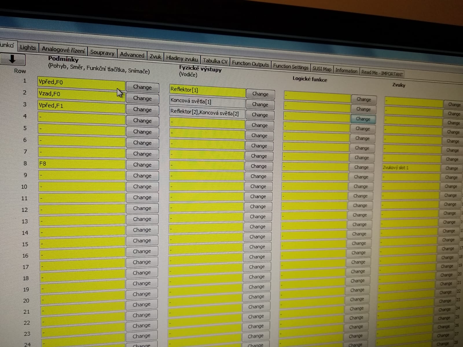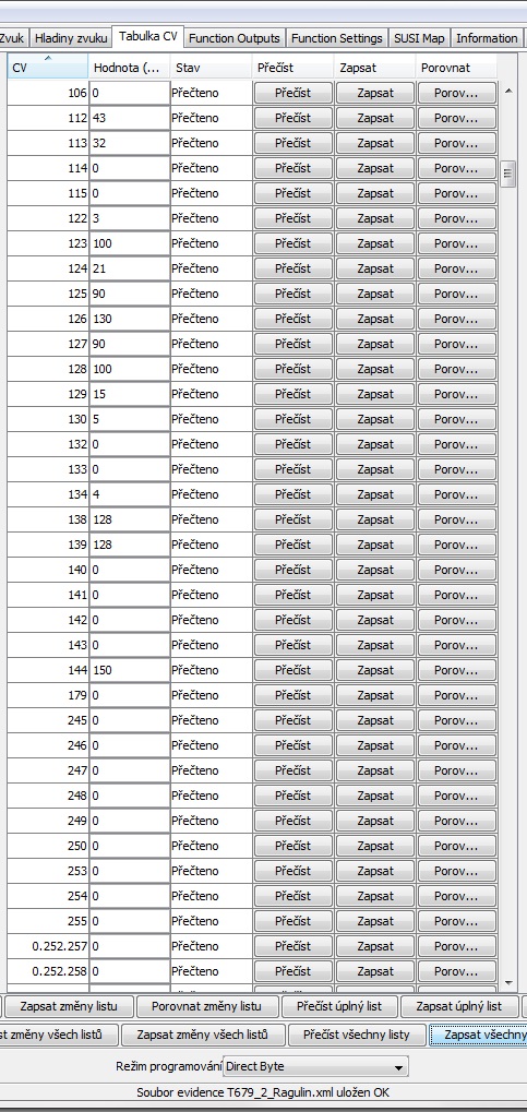 Takže už svítím dle potřeby ale dálkový reflektor nejde samotný.Pod F0 čelní osvětlení- přepíná se podle směru, červené osvětlení 1 strana F1 červené osvětlení druhá strana F2.Pokazil jsem to v nastavení/záložka Function Outputs vyhrazené odladění světel.Nacitam databáze z dekodéru do JMRI. Mezitím jsem si skočil koupit silikon a Karbolineum extra.Tabulku vyfotím a vložím sem.Je třeba provést další změny a to protože jsem si všiml že i při F8 jede mašina v posunu.