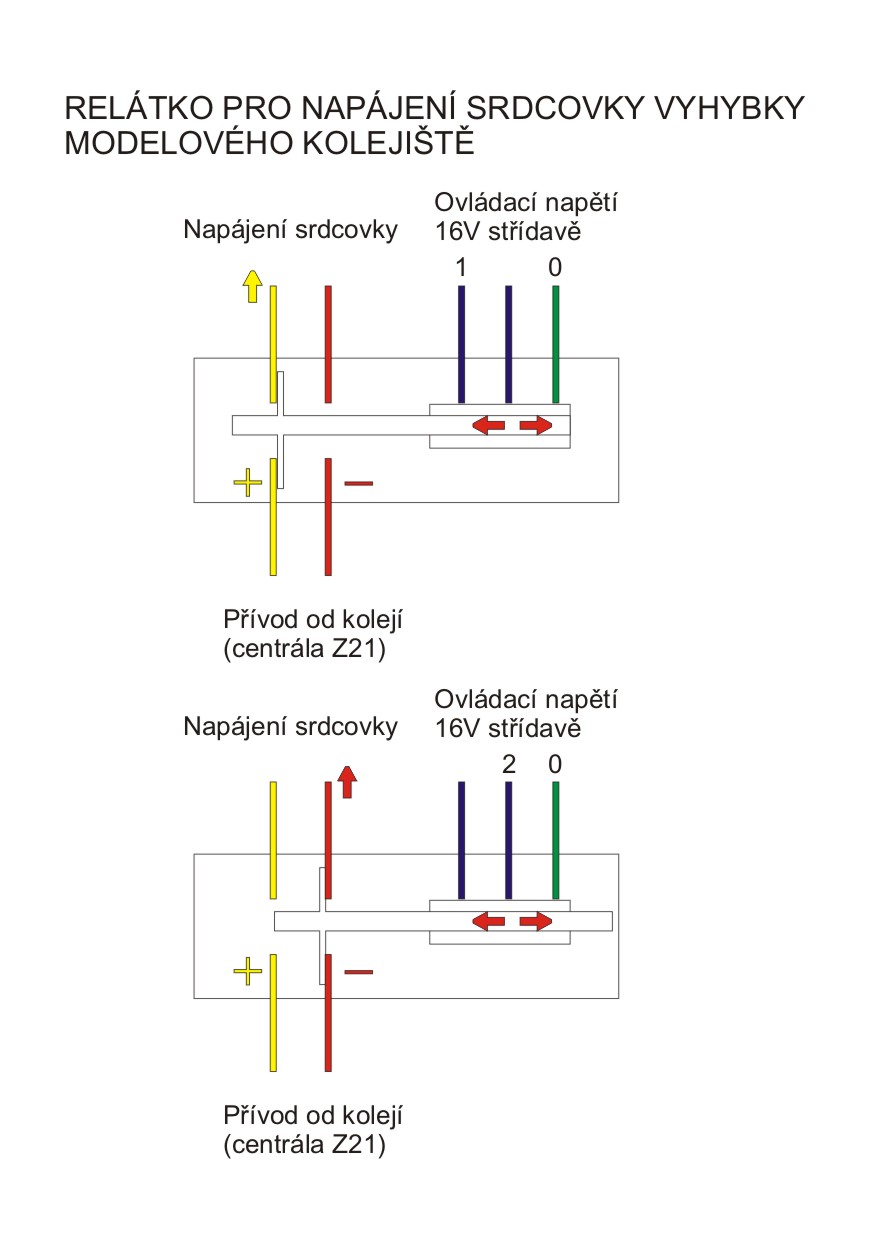 vemori píše:Mám takový problém. Na tomto diskuzním fóru se většina z vás shodla na tom, že pro digitální kolejiště z centrálou je lépe použít výhybky z vodivou srdcovkou. Jak ale takovou srdcovku napájet. Pokud nechci použít motorycké přestavníky pod kolejemi, ale elekromagnetické přestavníky vedle výhybek. Došel jsem k názoru že budu potřebovat tedy nějaké "relátko", které by pouštělo ten správný proud do srdcovky viz obrázek. Existuje tedy nějaké takové relátko nebo nějaké jiné efektivní řešení? Děkuji předem za vaše nápady a podněty.